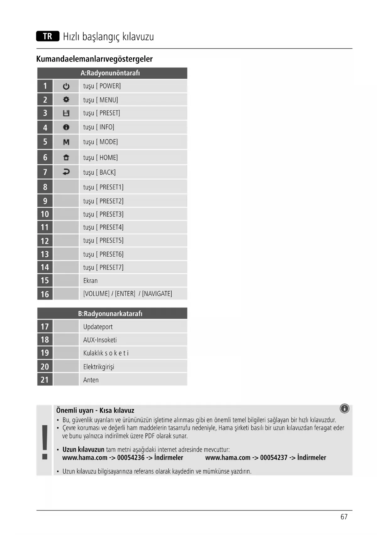 Düzenleme (AB) değişikliğiiçin no. 801/2013 No. 1275/2008 Durum Devreye girme süresi süre Güç tüketimi (Watt) Kapalı durumu (sadece 0/I şebeke şalterine sahip cihazlarda) – ≤ 0.50 W Bilgi veya durum göstergesi olmayan cihazlarda hazırolma durumu (bekleme modu) (manuel)* – ≤ 0.50 W Bilgi veya durum göstergesi olan cihazlarda hazırolma durumu (bekleme modu) (manuel)* – ≤ 1.00 W Bilgi veya durum göstergesi olmayan cihazlarda otomatik hazır olma durumu (bekleme modu)** ≤ 20 dak ≤ 0.50 W Bilgi veya durum göstergesi olan cihazlarda otomatik hazır olma durumu (bekleme modu)** ≤ 20 dak ≤ 1.00 W Ağ bağlantılı hazırolma işletimi*** ≤ 20 dak ≤ 2.00 W *Güç tuşuna basın ** Ağ bağlantılı olmayan -"Ağbağlantısınınkorunması -HAYIR". Mevcutsa, FM işletim modunda kullanılamaz. *** Ağ bağlantılı-"Ağbağlantısınınkorunması -EVET" Asılgüç tüketiminin birden fazla faktörebağlıolabileceğini lütfen dikkate alın. Buna, kişisel ayarlar,işletim modu, çevresıcaklığı ve ürünün kullanılan bellenim sürümü dahildir. Yukarıda belirtilen değerler maksimum değerlerdir. Asılreferans değerler için bkz.: www.hama.com -> 00054236 -> İndirmeler -> Tüketim bilgileri www.hama.com -> 00054237 -> İndirmeler -> Tüketim bilgileri72 M Instrucțiuni prescurtate Elemente de operare șiașaje A: Partea frontală aradioului