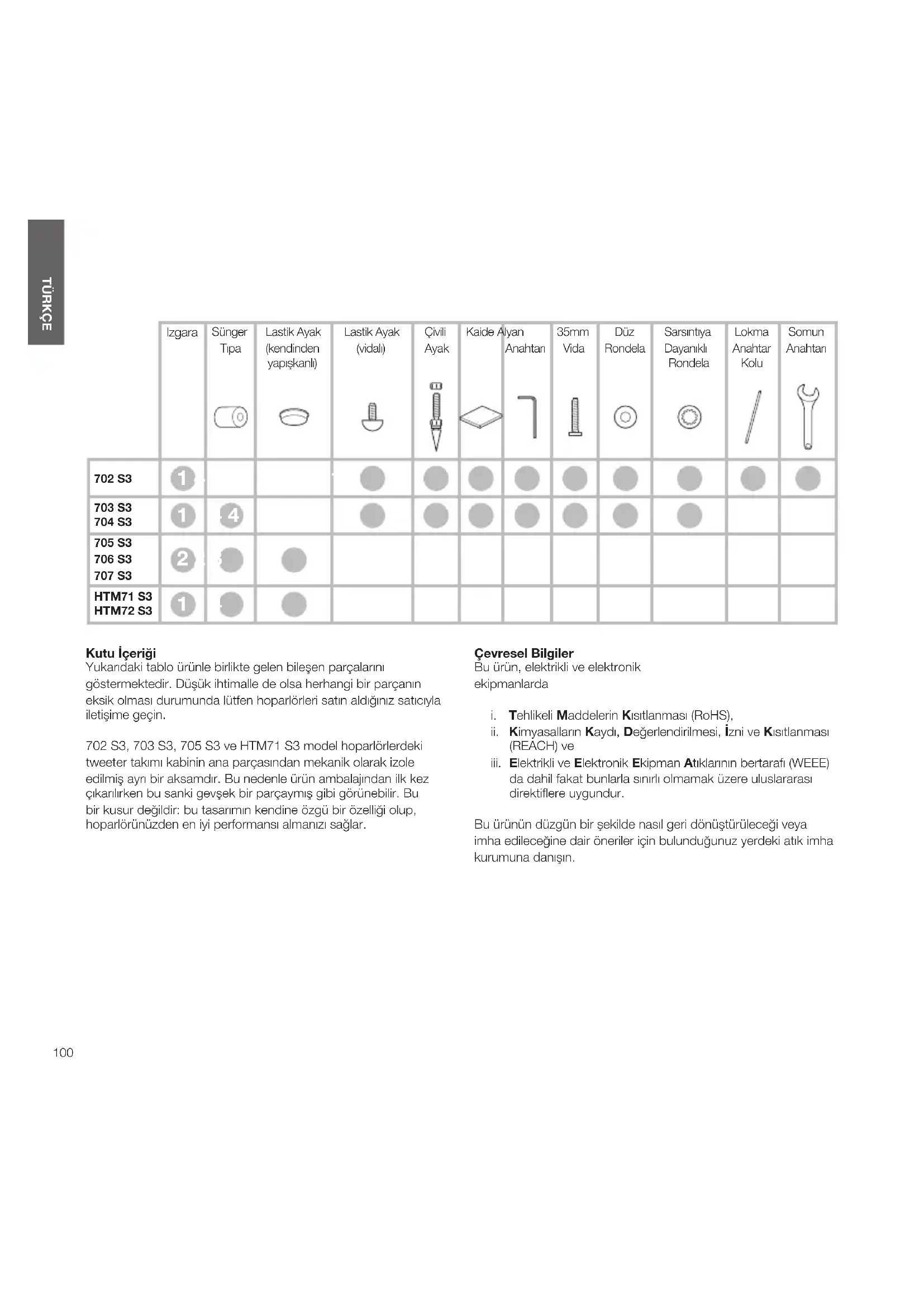 Kutu İçeriği Yukarıdaki tablo ürünle birlikte gelen bileşen parçalarını göstermektedir. Düşük ihtimalle de olsa herhangi bir parçanın eksik olması durumunda lütfen hoparlörleri satın aldığınız satıcıyla iletişime geçin. 702 S3, 703 S3, 705 S3 ve HTM71 S3 model hoparlörlerdeki tweeter takımı kabinin ana parçasından mekanik olarak izole edilmiş ayrı bir aksamdır. Bu nedenle ürün ambalajından ilk kez çıkarılırken bu sanki gevşek bir parçaymış gibi görünebilir. Bu bir kusur değildir: bu tasarımın kendine özgü bir özelliği olup, hoparlörünüzden en iyi performansı almanızı sağlar. Çevresel Bilgiler Bu ürün, elektrikli ve elektronik ekipmanlarda