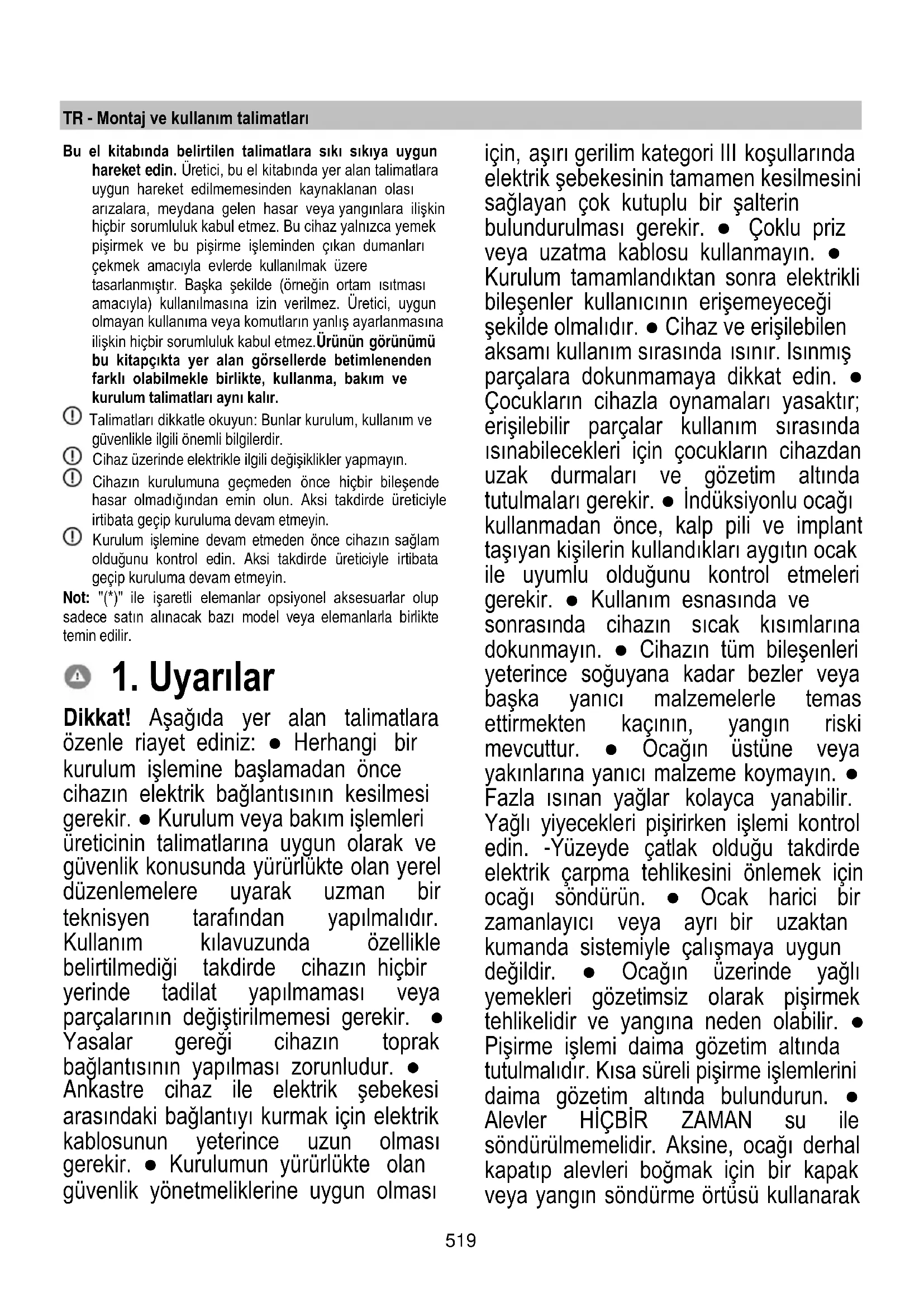 Dikkat! Aşağıda yer alan talimatlara özenle riayet ediniz: ● Herhangi bir kurulum işlemine başlamadan önce cihazın elektrik bağlantısının kesilmesi gerekir. ● Kurulum veya bakım işlemleri üreticinin talimatlarına uygun olarak ve güvenlik konusunda yürürlükte olan yerel düzenlemelere uyarak uzman bir teknisyen tarafından yapılmalıdır. Kullanım kılavuzunda özellikle belirtilmediği takdirde cihazın hiçbir yerinde tadilat yapılmaması veya parçalarının değiştirilmemesi gerekir. ● Yasalar gereği cihazın toprak bağlantısının yapılması zorunludur. ● Ankastre cihaz ile elektrik şebekesi arasındaki bağlantıyı kurmak için elektrik kablosunun yeterince uzun olması gerekir. ● Kurulumun yürürlükte olan güvenlik yönetmeliklerine uygun olması için, aşırı gerilim kategori III koşullarında elektrik şebekesinin tamamen kesilmesini sağlayan çok kutuplu bir şalterin bulundurulması gerekir. ● Çoklu priz veya uzatma kablosu kullanmayın. ● Kurulum tamamlandıktan sonra elektrikli bileşenler kullanıcının erişemeyeceği şekilde olmalıdır. ● Cihaz ve erişilebilen aksamı kullanım sırasında ısınır. Isınmış parçalara dokunmamaya dikkat edin. ● Çocukların cihazla oynamaları yasaktır; erişilebilir parçalar kullanım sırasında ısınabilecekleri için çocukların cihazdan uzak durmaları ve gözetim altında tutulmaları gerekir. ● İndüksiyonlu ocağı kullanmadan önce, kalp pili ve implant taşıyan kişilerin kullandıkları aygıtın ocak ile uyumlu olduğunu kontrol etmeleri gerekir. ● Kullanım esnasında ve sonrasında cihazın sıcak kısımlarına dokunmayın. ● Cihazın tüm bileşenleri yeterince soğuyana kadar bezler veya başka yanıcı malzemelerle temas ettirmekten kaçının, yangın riski mevcuttur. ● Ocağın üstüne veya yakınlarına yanıcı malzeme koymayın. ● Fazla ısınan yağlar kolayca yanabilir. Yağlı yiyecekleri pişirirken işlemi kontrol edin. -Yüzeyde çatlak olduğu takdirde elektrik çarpma tehlikesini önlemek için ocağı söndürün. ● Ocak harici bir zamanlayıcı veya ayrı bir uzaktan kumanda sistemiyle çalışmaya uygun değildir. ● Ocağın üzerinde yağlı yemekleri gözetimsiz olarak pişirmek tehlikelidir ve yangına neden olabilir. ● Pişirme işlemi daima gözetim altında tutulmalıdır. Kısa süreli pişirme işlemlerini daima gözetim altında bulundurun. ● Alevler HİÇBİR ZAMAN su ile söndürülmemelidir. Aksine, ocağı derhal kapatıp alevleri boğmak için bir kapak veya yangın söndürme örtüsü kullanarak520 söndürün. Yangın tehlikesi: Pişirme yüzeylerinin üzerine eşya koymayın. ● Buharlı temizleyici kullanmayın, elektrik çarpması riski mevcuttur. ● Fazla ısınma tehlikesi oluşabileceğinden, ocağın üzerine bıçak, çatal, kaşık ve kapak gibi metal malzeme koymayın. ● Cihazı elektrik şebekesine bağlamadan önce: Gerilim ve güç değerlerinin şebekenin değerlerine karşılık geldiğinden ve bağlantı prizinin uygun olduğundan emin olmak için bilgi plakasını kontrol edin (cihazın alt kısmında bulunur). Şüpheye düşerseniz, ehil bir elektrik teknisyeniyle bağlantı kurun. Önemli: ● Kullanımdan sonra, ocağı kumandasıyla kapatın, tencere algılayıcısına güvenmeyin. ● Sıvıların taşmasını önlemek için haşlama veya ısıtma yaparken ısı beslemesini düşürün. ● Ocağın ısıtma elemanlarının üzerinde boş tencere veya tava bırakmayın. ● Pişirme işlemi sona erer ermez ilgili pişirme bölgesini kapatın. ● Pişirme sırasında kesinlikle alüminyum folyo kullanmayın ve alüminyum ambalajlı ürünleri doğrudan yerleştirmeyin. Alüminyum eriyip ocakta geri dönüşü olanaksız zararlara yol açabilir. ● Öncesinde açmadan yiyecek içeren metal kutu veya tenekeleri kesinlikle ısıtmayın: patlama meydana gelebilir! Bu uyarı tüm diğer ocak tipleri için geçerlidir. ● Takviye özelliği gibi yüksek güçlü bir fonksiyonu kullanmak kızartma yağı gibi bazı sıvıları ısıtmak için uygun değildir. Yüksek ısı tehlikeli olabilir. Bu durumlarda daha düşük bir ısıtma gücü kullanılması tavsiye edilir. ● Kaplar doğrudan ocağın üzerine ve ısıtma bölümlerinin ortasına yerleştirilmelidir. Tencere ve ocak arasında kesinlikle başka nesne olmamalıdır. ● Yüksek sıcaklık söz konusu olduğunda cihaz otomatik olarak pişirme bölgelerinin güç seviyesini düşürür. ● Herhangi bir temizlik veya bakım işlemi yapmadan önce elektrik fişini prizden çekerek veya evinizdeki ana şalteri kapatarak cihazın elektrik şebekesiyle olan bağlantısını kesin. ● Tüm kurulum ve bakım işlemlerinde iş eldiveni kullanın. ● Bu cihaz 8 yaşından büyük çocuklar ile fiziksel, duyusal veya zihinsel kapasitesi düşük veya deneyimden ve gerekli bilgiden yoksun kişilerce yalnızca gözetim altındayken veya cihazın güvenli kullanımına ilişkin talimatlar verildikten ve bu durumla ilgili tehlikeleri anlamaları sağlandıktan sonra kullanılabilir. ● Cihazla oynamadıklarından emin olmak için çocuklar kontrol altında tutulmalıdır. ● Temizlik ve bakım işlemleri çocuklar tarafından gözetimsiz olarak yapılmamalıdır. ● Bu cihaz gaz veya başka yakıtları yakan diğer cihazlarla aynı anda kullanılacağı zaman söz konusu yerde yeterli havalandırma bulunmalıdır. ● Cihazın dışı ve içi sık sık (EN AZINDAN AYDA BİR) temizlenmelidir; her koşulda bakım talimatlarında açıkça belirtilenlere uygun hareket edin. ● Cihazla ilgili temizlik kuralları ile filtreleri değiştirme ve temizleme kurallarına uygun hareket edilmemesi yangın risklerinin doğmasına neden olur. ● Flambe usulü yemek pişirmek kesinlikle yasaktır. ● Açık alev kullanmak filtreler açısından zararlıdır ve yangınlara neden olabilir, bu nedenle her durumda kaçınılmalıdır. ● Aş