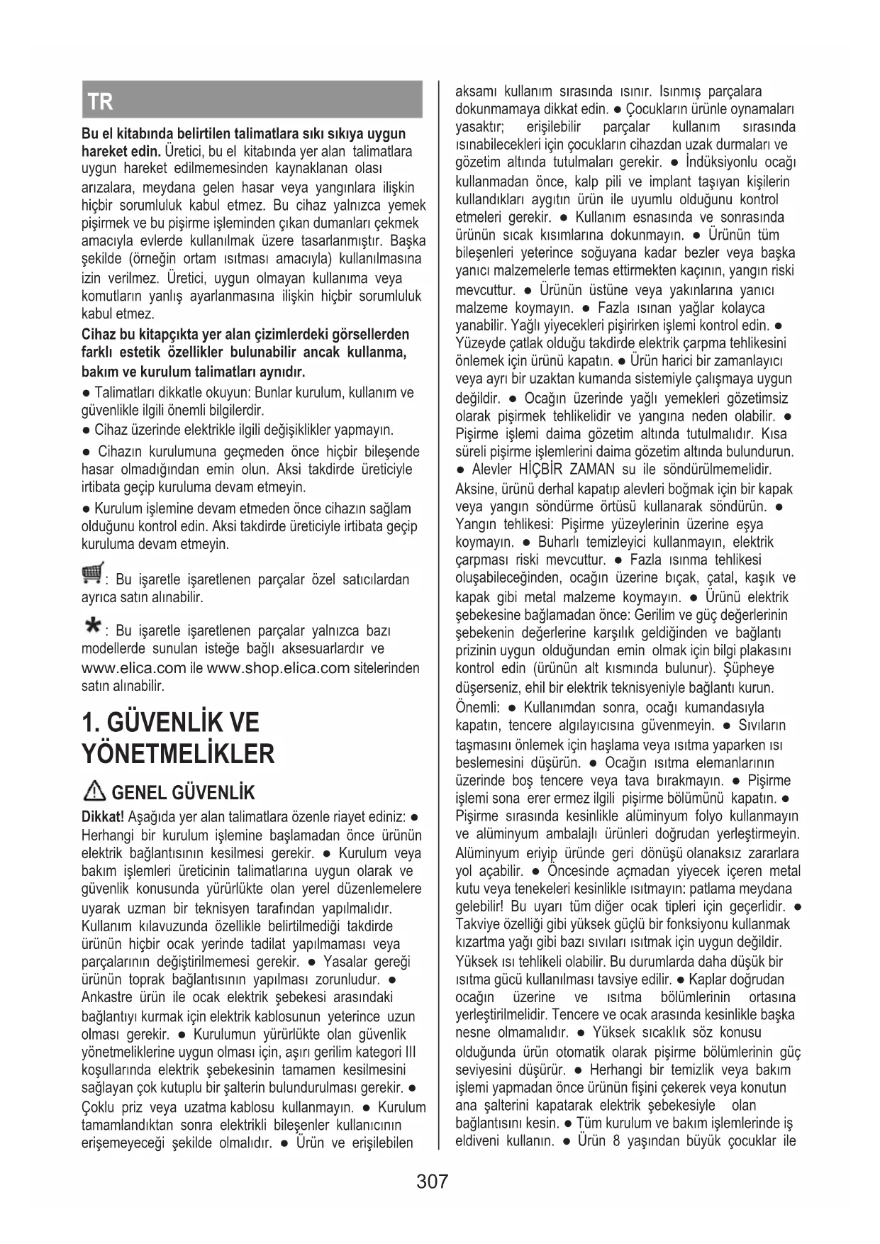 Prije nego što kontaktirate Službu za korisnike 1.Provjerite je li moguće samostalno riješiti problem na temelju točaka opisanih u "Pretraživanje kvarova". 2.Ugasite i ponovno upalite uređaj da provjerite da li problem i dalje postoji. Ako i nakon gore navedenih provjera problem i dalje postoji, obratite se najbližoj Službi za korisnike. 306TR Bu el kitabında belirtilen talimatlara sıkı sıkıya uygun hareket edin. Üretici, bu el kitabında yer alan talimatlara uygun hareket edilmemesinden kaynaklanan olası arızalara, meydana gelen hasar veya yangınlara ilişkin hiçbir sorumluluk kabul etmez. Bu cihaz yalnızca yemek pişirmek ve bu pişirme işleminden çıkan dumanları çekmek amacıyla evlerde kullanılmak üzere tasarlanmıştır. Başka şekilde (örneğin ortam ısıtması amacıyla) kullanılmasına izin verilmez. Üretici, uygun olmayan kullanıma veya komutların yanlış ayarlanmasına ilişkin hiçbir sorumluluk kabul etmez. Cihaz bu kitapçıkta yer alan çizimlerdeki görsellerden farklı estetik özellikler bulunabilir ancak kullanma, bakım ve kurulum talimatları aynıdır. ● Talimatları dikkatle okuyun: Bunlar kurulum, kullanım ve güvenlikle ilgili önemli bilgilerdir. ● Cihaz üzerinde elektrikle ilgili değişiklikler yapmayın. ● Cihazın kurulumuna geçmeden önce hiçbir bileşende hasar olmadığından emin olun. Aksi takdirde üreticiyle irtibata geçip kuruluma devam etmeyin. ● Kurulum işlemine devam etmeden önce cihazın sağlam olduğunu kontrol edin. Aksi takdirde üreticiyle irtibata geçip kuruluma devam etmeyin. : Bu işaretle işaretlenen parçalar özel satıcılardan ayrıca satın alınabilir. : Bu işaretle işaretlenen parçalar yalnızca bazı modellerde sunulan isteğe bağlı aksesuarlardır ve www.elica.com ile www.shop.elica.com sitelerinden satın alınabilir.