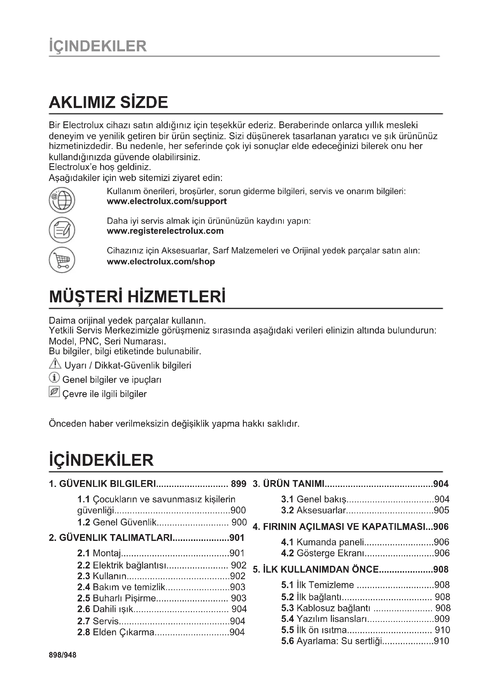 Bir Electrolux cihazı satın aldığınız için teşekkür ederiz. Beraberinde onlarca yıllık mesleki deneyim ve yenilik getiren bir ürün seçtiniz. Sizi düşünerek tasarlanan yaratıcı ve şık ürününüz hizmetinizdedir. Bu nedenle, her seferinde çok iyi sonuçlar elde edeceğinizi bilerek onu her kullandığınızda güvende olabilirsiniz. Electrolux’e hoş geldiniz. Aşağıdakiler için web sitemizi ziyaret edin: Kullanım önerileri, broşürler, sorun giderme bilgileri, servis ve onarım bilgileri: www.electrolux.com/support Daha iyi servis almak için ürününüzün kaydını yapın: www.registerelectrolux.com Cihazınız için Aksesuarlar, Sarf Malzemeleri ve Orijinal yedek parçalar satın alın: www.electrolux.com/shop