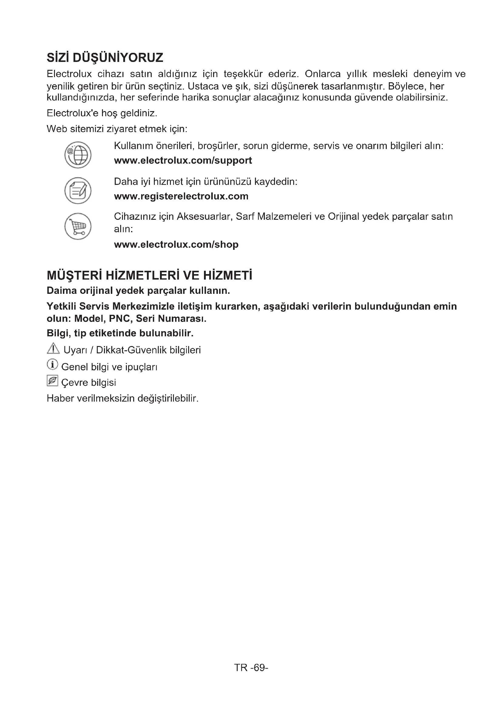 Electrolux cihazı satın aldığınız için teşekkür ederiz. Onlarca yıllık mesleki deneyim ve yenilik getiren bir ürün seçtiniz. Ustaca ve şık, sizi düşünerek tasarlanmıştır. Böylece, her kullandığınızda, her seferinde harika sonuçlar alacağınız konusunda güvende olabilirsiniz. Electrolux'e hoş geldiniz. Web sitemizi ziyaret etmek için: Kullanım önerileri, broşürler, sorun giderme, servis ve onarım bilgileri alın: www.electrolux.com/support Daha iyi hizmet için ürününüzü kaydedin: www.registerelectrolux.com Cihazınız için Aksesuarlar, Sarf Malzemeleri ve Orijinal yedek parçalar satın alın: www.electrolux.com/shop MÜŞTERİ HİZMETLERİ VE HİZMETİ Daima orijinal yedek parçalar kullanın. Yetkili Servis Merkezimizle iletişim kurarken, aşağıdaki verilerin bulunduğundan emin olun: Model, PNC, Seri Numarası. Bilgi, tip etiketinde bulunabilir. Uyarı / Dikkat-Güvenlik bilgileri Genel bilgi ve ipuçları Çevre bilgisi Haber verilmeksizin değiştirilebilir.TR -70- CİHAZINIZI KULLANMADAN ÖNCE BÖLÜM - 1. Genel uyarılar Lütfen cihazınızı kurmadan ve kullanmadan önce kullanım kılavuzunu dikkatlice okuyun. Yanlış kullanımdan kaynaklanan hasarlardan sorumlu değiliz. Cihazınız ve kullanım kılavuzunuzdaki tüm talimatlara uyun ve ileride oluşabilecek sorunları çözmek için bu kılavuzu güvenli bir yerde saklayın. Bu cihaz yerleşik bir cihaz olarak kullanılmak üzere tasarlanmamıştır. Kullanım boyutlarında gerekli olan boşluğa göre bağımsız kurulumdan farklı kurulum durumunda, cihaz düzgün çalışacaktır ancak enerji tüketimi biraz artabilir. UYARI: Cihazın mahfazasında veya gövdesinde bulunan havalandırma deliklerini açık tutunuz. UYARI: Buz çözme işlemini hızlandırmak için mekanik araçlar veya başka yapay yöntemler kullanmayın. UYARI: Üretici tarafından önerilmedikçe, cihazın yiyecek saklanan kısımlarında elektrikli cihazlar kullanmayın. UYARI: Buzdolabının soğutucu gaz devresine zarar vermeyin. UYARI: Ürünün dengesizliğinden kaynaklanabilecek zararlardan kaçınmak için, talimatlara uygun olarak ürün sabitlenmelidir. UYARI: Cihazı yerleştirirken besleme kablosunun sıkışmadığından veya hasar görmediğinden emin olun. UYARI: Taşınabilir çoklu prizleri veya taşınabilir güç kaynaklarını cihazın arkasında bulundurmayın.TR -71- Eğer ürününüz soğutucu akışkan olarak R600a kullanıyorsa –bu bilgiyi soğutucudaki etiketten görebilirsiniz- taşıma ve montaj sırasında soğutma elemanlarının hasar görmemesi için dikkatli olunması gerekir. R600a çevre dostu ve doğal bir gaz olmasına karşın patlayıcı özelliğe sahip olduğundan, soğutma elamanlarındaki herhangibir hasar nedeniyle oluşacak bir sızıntı sırasında buzdolabınızı açık alev veya ısı kaynağından uzaklaştırıp cihazın bulunduğu ortamı birkaç dakika süreyle havalandırınız.