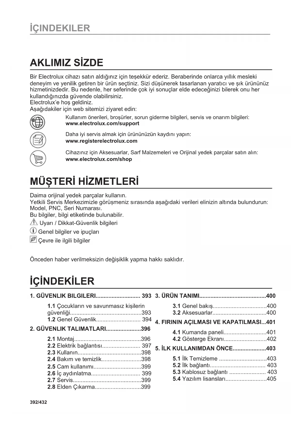 Bir Electrolux cihazı satın aldığınız için teşekkür ederiz. Beraberinde onlarca yıllık mesleki deneyim ve yenilik getiren bir ürün seçtiniz. Sizi düşünerek tasarlanan yaratıcı ve şık ürününüz hizmetinizdedir. Bu nedenle, her seferinde çok iyi sonuçlar elde edeceğinizi bilerek onu her kullandığınızda güvende olabilirsiniz. Electrolux’e hoş geldiniz. Aşağıdakiler için web sitemizi ziyaret edin: Kullanım önerileri, broşürler, sorun giderme bilgileri, servis ve onarım bilgileri: www.electrolux.com/support Daha iyi servis almak için ürününüzün kaydını yapın: www.registerelectrolux.com Cihazınız için Aksesuarlar, Sarf Malzemeleri ve Orijinal yedek parçalar satın alın: www.electrolux.com/shop