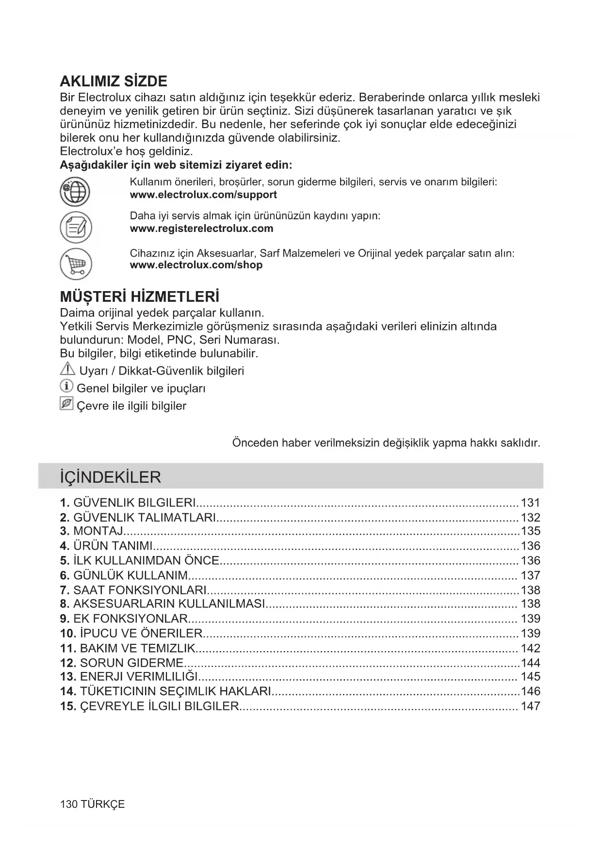 Bir Electrolux cihazı satın aldığınız için teşekkür ederiz. Beraberinde onlarca yıllık mesleki deneyim ve yenilik getiren bir ürün seçtiniz. Sizi düşünerek tasarlanan yaratıcı ve şık ürününüz hizmetinizdedir. Bu nedenle, her seferinde çok iyi sonuçlar elde edeceğinizi bilerek onu her kullandığınızda güvende olabilirsiniz. Electrolux’e hoş geldiniz. Aşağıdakiler için web sitemizi ziyaret edin: Kullanım önerileri, broşürler, sorun giderme bilgileri, servis ve onarım bilgileri: www.electrolux.com/support Daha iyi servis almak için ürününüzün kaydını yapın: www.registerelectrolux.com Cihazınız için Aksesuarlar, Sarf Malzemeleri ve Orijinal yedek parçalar satın alın: www.electrolux.com/shop