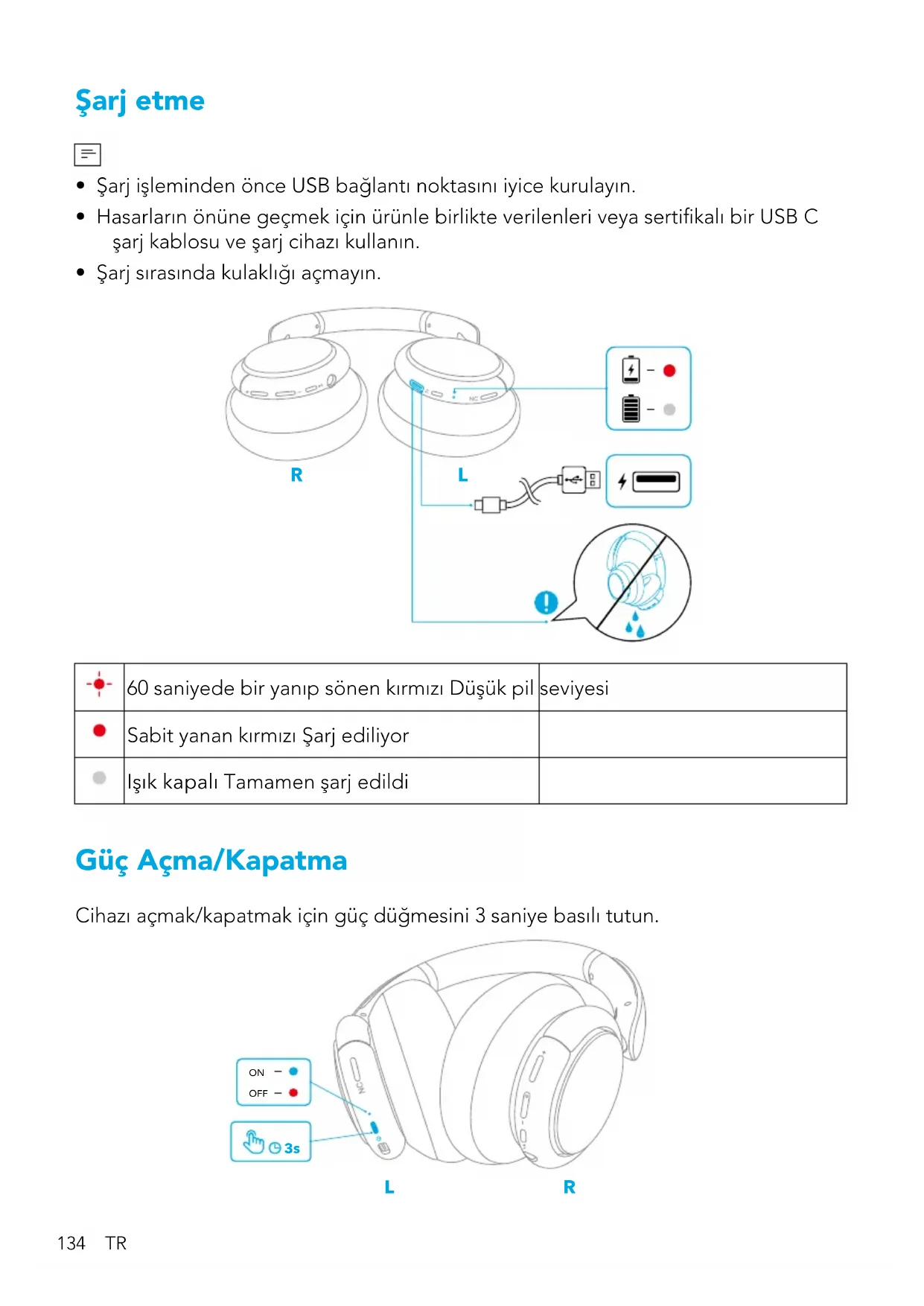 - Şarj sırasında kulaklığı açmayın. R L 60 saniyede bir yanıp sönen kırmızı Düşük pil seviyesi Sabit yanan kırmızı Şarj ediliyor Işık kapalı Tamamen şarj edildi Güç Açma/Kapatma Cihazı açmak/kapatmak için güç düğmesini 3 saniye basılı tutun.