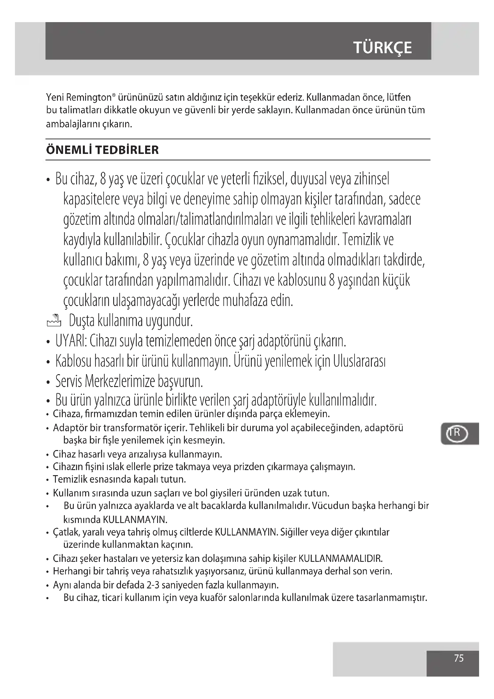 AE114115116 Model No CR6000 Taşıma ve nakliye sırasında dikkat edilecek hususlar : - Ürünü düşürmeyiniz - Darbelere maruz kalmamasını sağlayınız - Cihazı nakliye sırasında orijinal ambalajında taşıyınız. Bakanlıkça tespit ve ilan edilen kullanım ömrü 7 yıldır. Çin Halk Cumhuriyetinde üretilmiştir. 100-240В~50/60Гц 1A 17/INT/ CR6000 T22-0005404 Version 11 /17 Remington® is a Registered Trade Mark of Spectrum Brands,Inc., or one of its subsidiaries VARTA Consumer Batteries GmbH & Co. KGaA, Alfred-Krupp-Str. 9, 73479 Ellwangen, Germany www.remington-europe.com © 2017 Spectrum Brands, Inc.