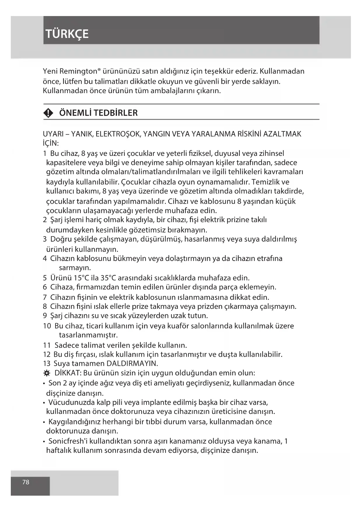 UYARI – YANIK, ELEKTROŞOK, YANGIN VEYA YARALANMA RİSKİNİ AZALTMAK İÇİN: 1 Bu cihaz, 8 yaş ve üzeri çocuklar ve yeterli ziksel, duyusal veya zihinsel kapasitelere veya bilgi ve deneyime sahip olmayan kişiler tarafından, sadece gözetim altında olmaları/talimatlandırılmaları ve ilgili tehlikeleri kavramaları kaydıyla kullanılabilir. Çocuklar cihazla oyun oynamamalıdır. Temizlik ve kullanıcı bakımı, 8 yaş veya üzerinde ve gözetim altında olmadıkları takdirde, çocuklar tarafından yapılmamalıdır. Cihazı ve kablosunu 8 yaşından küçük çocukların ulaşamayacağı yerlerde muhafaza edin. 2 Şarj işlemi hariç olmak kaydıyla, bir cihazı, şi elektrik prizine takılı durumdayken kesinlikle gözetimsiz bırakmayın. 3 Doğru şekilde çalışmayan, düşürülmüş, hasarlanmış veya suya daldırılmış ürünleri kullanmayın. 4 Cihazın kablosunu bükmeyin veya dolaştırmayın ya da cihazın etrafına sarmayın. 5 Ürünü 15°C ila 35°C arasındaki sıcaklıklarda muhafaza edin. 6 Cihaza, rmamızdan temin edilen ürünler dışında parça eklemeyin. 7 Cihazın şinin ve elektrik kablosunun ıslanmamasına dikkat edin. 8 Cihazın şini ıslak ellerle prize takmaya veya prizden çıkarmaya çalışmayın. 9 Şarj cihazını su ve sıcak yüzeylerden uzak tutun. 10 Bu cihaz, ticari kullanım için veya kuaför salonlarında kullanılmak üzere tasarlanmamıştır. 11 Sadece talimat verilen şekilde kullanın. 12 Bu diş fırçası, ıslak kullanım için tasarlanmıştır ve duşta kullanılabilir. 13 Suya tamamen DALDIRMAYIN. , DİKKAT: Bu ürünün sizin için uygun olduğundan emin olun: