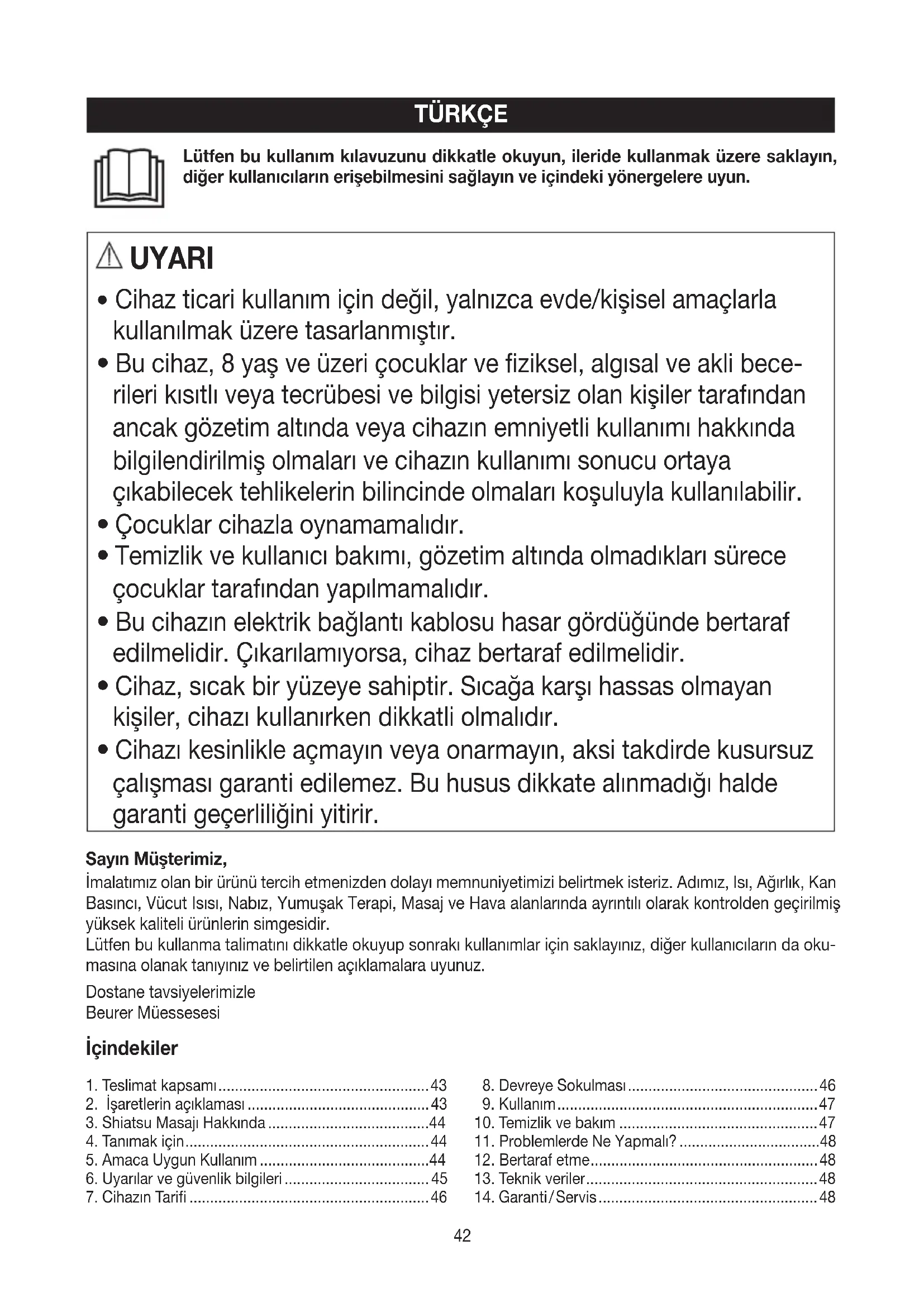 Cihazı kesinlikle açmayın veya onarmayın, aksi takdirde kusursuz çalışması garanti edilemez. Bu husus dikkate alınmadığı halde garanti geçerliliğini yitirir. Sayın Müşterimiz, İmalatımız olan bir ürünü tercih etmenizden dolayı memnuniyetimizi belirtmek isteriz. Adımız, Isı, Ağırlık, Kan Basıncı, Vücut Isısı, Nabız, Yumuşak Terapi, Masaj ve Hava alanlarında ayrıntılı olarak kontrolden geçirilmiş yüksek kaliteli ürünlerin simgesidir. Lütfen bu kullanma talimatını dikkatle okuyup sonrakı kullanımlar için saklayınız, diğer kullanıcıların da oku masına olanak tanıyınız ve belirtilen açıklamalara uyunuz.Dostane tavsiyelerimizle Beurer Müessesesi43