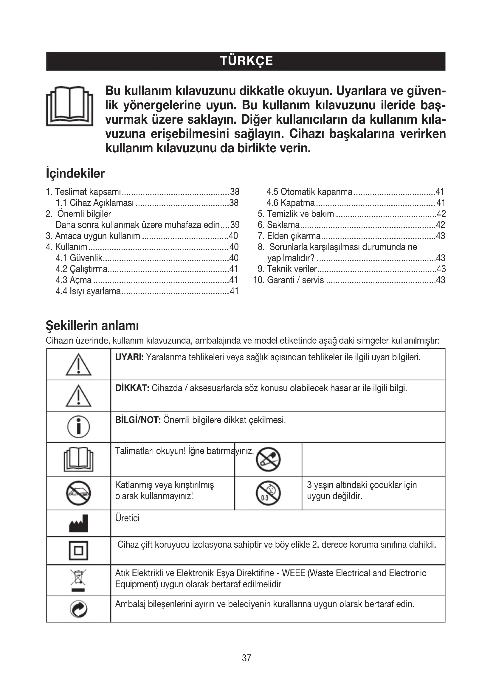 Per ulteriori informazioni sulla garanzia e sulle condizioni di garanzia, consultare la scheda di garanzia fornita. Possibili errori e variazioni37 Şekillerin anlamı Cihazın üzerinde, kullanım kılavuzunda, ambalajında ve model etiketinde aşağıdaki simgeler kullanılmıştır: UYARI: Yaralanma tehlikeleri veya sağlık açısından tehlikeler ile ilgili uyarı bilgileri. DİKKAT: Cihazda / aksesuarlarda söz konusu olabilecek hasarlar ile ilgili bilgi. BİLGİ/NOT: Önemli bilgilere dikkat çekilmesi. Talimatları okuyun! İğne batırmayınız! Katlanmış veya kırıştırılmış olarak kullanmayınız! 3 yaşın altındaki çocuklar için uygun değildir. Üretici Cihaz çift koruyucu izolasyona sahiptir ve böylelikle 2. derece koruma sınıfına dahildi. Atık Elektrikli ve Elektronik Eşya Direktifine - WEEE (Waste Electrical and Electronic Equipment) uygun olarak bertaraf edilmelidir Ambalaj bileşenlerini ayırın ve belediyenin kurallarına uygun olarak bertaraf edin.