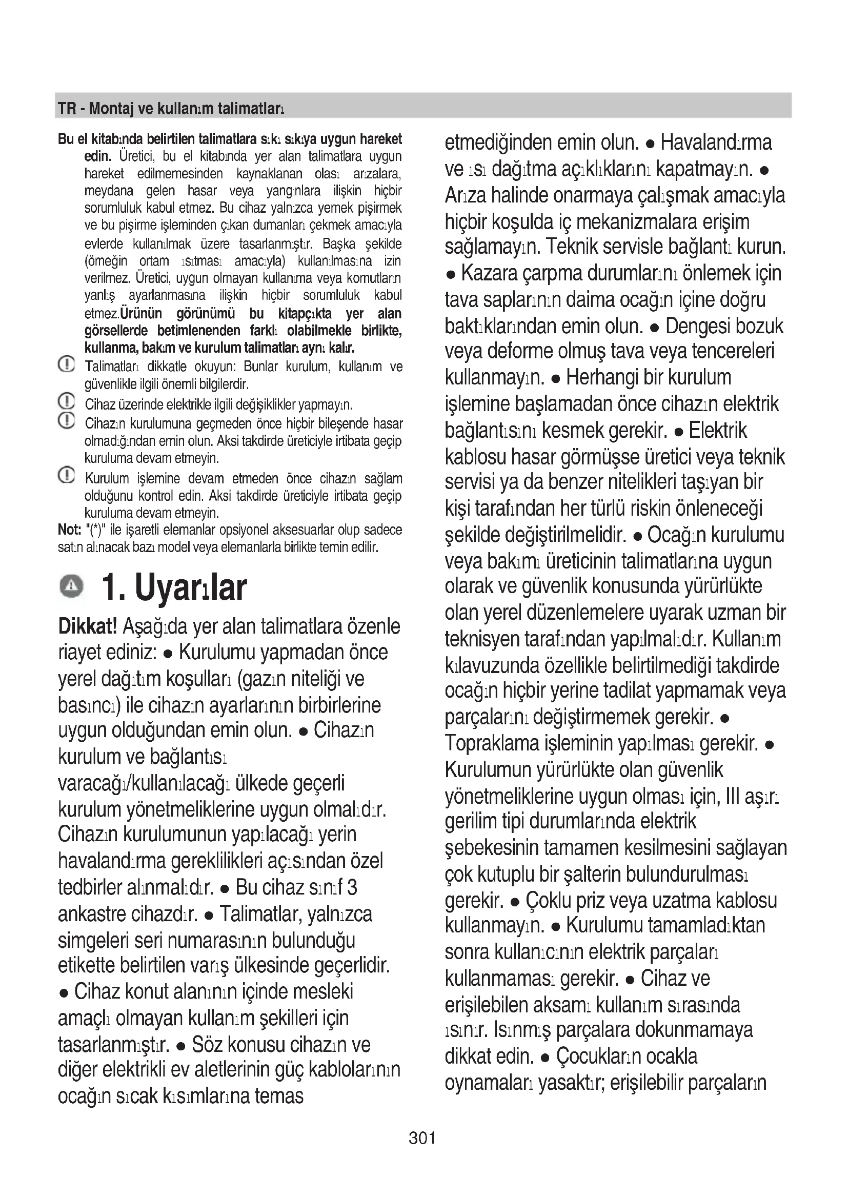 - serijski broj (S/N) Posljednji podatci nalaze se na pločici s karakteristikama na uređaju i/ili na ambalaži. ! Nikada ne upotrebljavajte neovlaštene tehničare za popravak i uvijek odbijte ugradnju neoriginalnih rezervnih dijelova.301 TR - Montaj ve kullanım talimatları Bu el kitabında belirtilen talimatlara sıkı sıkıya uygun hareket edin. Üretici, bu el kitabında yer alan talimatlara uygun hareket edilmemesinden kaynaklanan olası arızalara, meydana gelen hasar veya yangınlara ilişkin hiçbir sorumluluk kabul etmez. Bu cihaz yalnızca yemek pişirmek ve bu pişirme işleminden çıkan dumanları çekmek amacıyla evlerde kullanılmak üzere tasarlanmıştır. Başka şekilde (örneğin ortam ısıtması amacıyla) kullanılmasına izin verilmez. Üretici, uygun olmayan kullanıma veya komutların yanlış ayarlanmasına ilişkin hiçbir sorumluluk kabul etmez.Ürünün görünümü bu kitapçıkta yer alan görsellerde betimlenenden farklı olabilmekle birlikte, kullanma, bakım ve kurulum talimatları aynı kalır. Talimatları dikkatle okuyun: Bunlar kurulum, kullanım ve güvenlikle ilgili önemli bilgilerdir. Cihaz üzerinde elektrikle ilgili değişiklikler yapmayın. Cihazın kurulumuna geçmeden önce hiçbir bileşende hasar olmadığından emin olun. Aksi takdirde üreticiyle irtibata geçip kuruluma devam etmeyin. Kurulum işlemine devam etmeden önce cihazın sağlam olduğunu kontrol edin. Aksi takdirde üreticiyle irtibata geçip kuruluma devam etmeyin. Not: "(*)" ile işaretli elemanlar opsiyonel aksesuarlar olup sadece satın alınacak bazı model veya elemanlarla birlikte temin edilir.