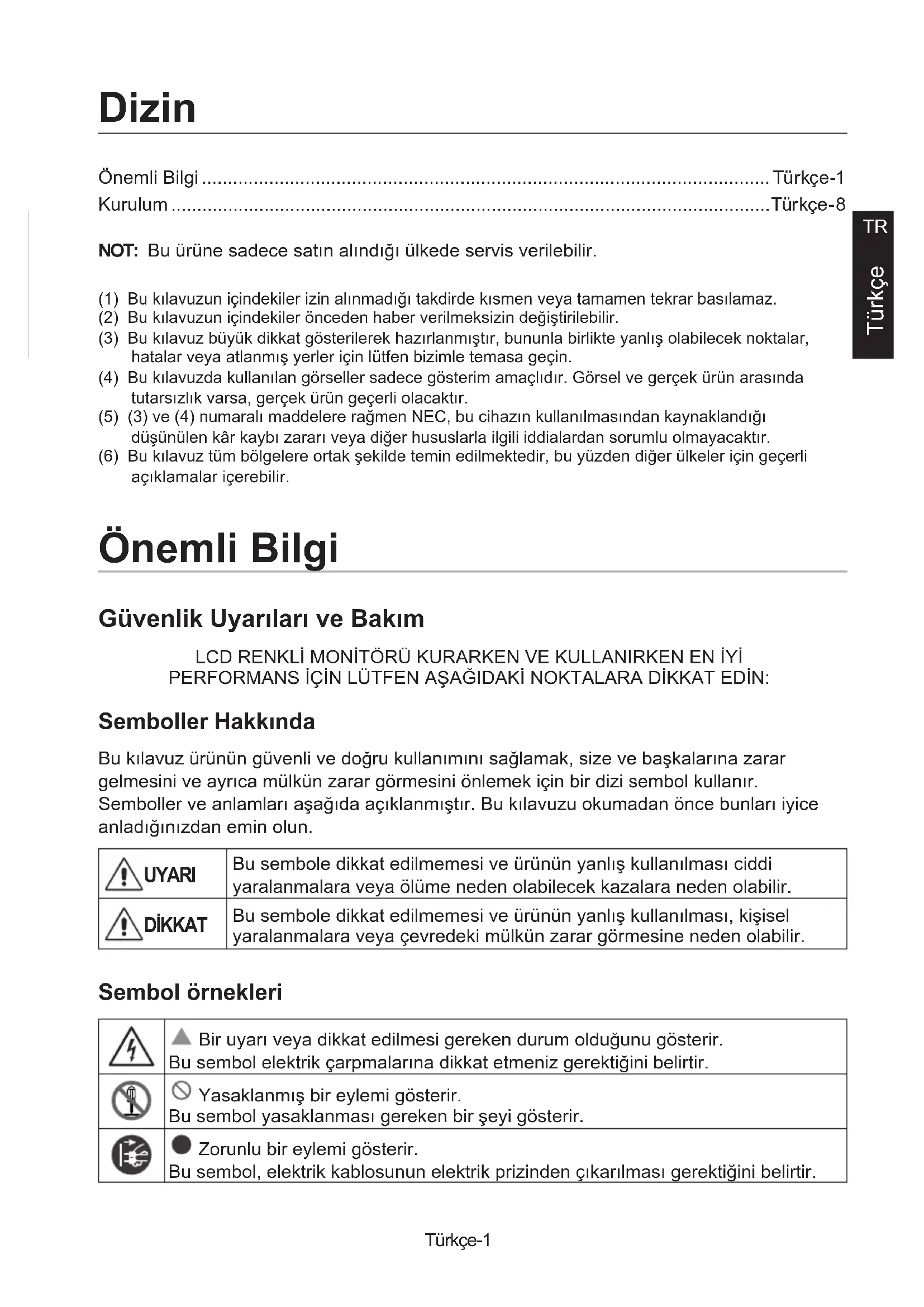 Türkçe Önemli Bilgi ..............................................................................................................Türkçe-1 Kurulum ....................................................................................................................Türkçe-8 Dizin NOT: Bu ürüne sadece satın alındığı ülkede servis verilebilir. (1) Bu kılavuzun içindekiler izin alınmadığı takdirde kısmen veya tamamen tekrar basılamaz.(2) Bu kılavuzun içindekiler önceden haber verilmeksizin değiştirilebilir.(3) Bu kılavuz büyük dikkat gösterilerek hazırlanmıştır, bununla birlikte yanlış olabilecek noktalar, hatalar veya atlanmış yerler için lütfen bizimle temasa geçin.(4) Bu kılavuzda kullanılan görseller sadece gösterim amaçlıdır. Görsel ve gerçek ürün arasında tutarsızlık varsa, gerçek ürün geçerli olacaktır.(5) (3) ve (4) numaralı maddelere rağmen NEC, bu cihazın kullanılmasından kaynaklandığı düşünülen kâr kaybı zararı veya diğer hususlarla ilgili iddialardan sorumlu olmayacaktır.(6) Bu kılavuz tüm bölgelere ortak şekilde temin edilmektedir, bu yüzden diğer ülkeler için geçerli açıklamalar içerebilir. Önemli Bilgi Güvenlik Uyarıları ve Bakım LCD RENKLİ MONİTÖRÜ KURARKEN VE KULLANIRKEN EN İYİ PERFORMANS İÇİN LÜTFEN AŞAĞIDAKİ NOKTALARA DİKKAT EDİN: Semboller Hakkında Bu kılavuz ürünün güvenli ve doğru kullanımını sağlamak, size ve başkalarına zarar gelmesini ve ayrıca mülkün zarar görmesini önlemek için bir dizi sembol kullanır. Semboller ve anlamları aşağıda açıklanmıştır. Bu kılavuzu okumadan önce bunları iyice anladığınızdan emin olun. UYARI Bu sembole dikkat edilmemesi ve ürünün yanlış kullanılması ciddi yaralanmalara veya ölüme neden olabilecek kazalara neden olabilir. DİKKAT Bu sembole dikkat edilmemesi ve ürünün yanlış kullanılması, kişisel yaralanmalara veya çevredeki mülkün zarar görmesine neden olabilir. Sembol örnekleri Bir uyarı veya dikkat edilmesi gereken durum olduğunu gösterir. Bu sembol elektrik çarpmalarına dikkat etmeniz gerektiğini belirtir. Yasaklanmış bir eylemi gösterir. Bu sembol yasaklanması gereken bir şeyi gösterir. Zorunlu bir eylemi gösterir. Bu sembol, elektrik kablosunun elektrik prizinden çıkarılması gerektiğini belirtir.Türkçe-2 UYARI