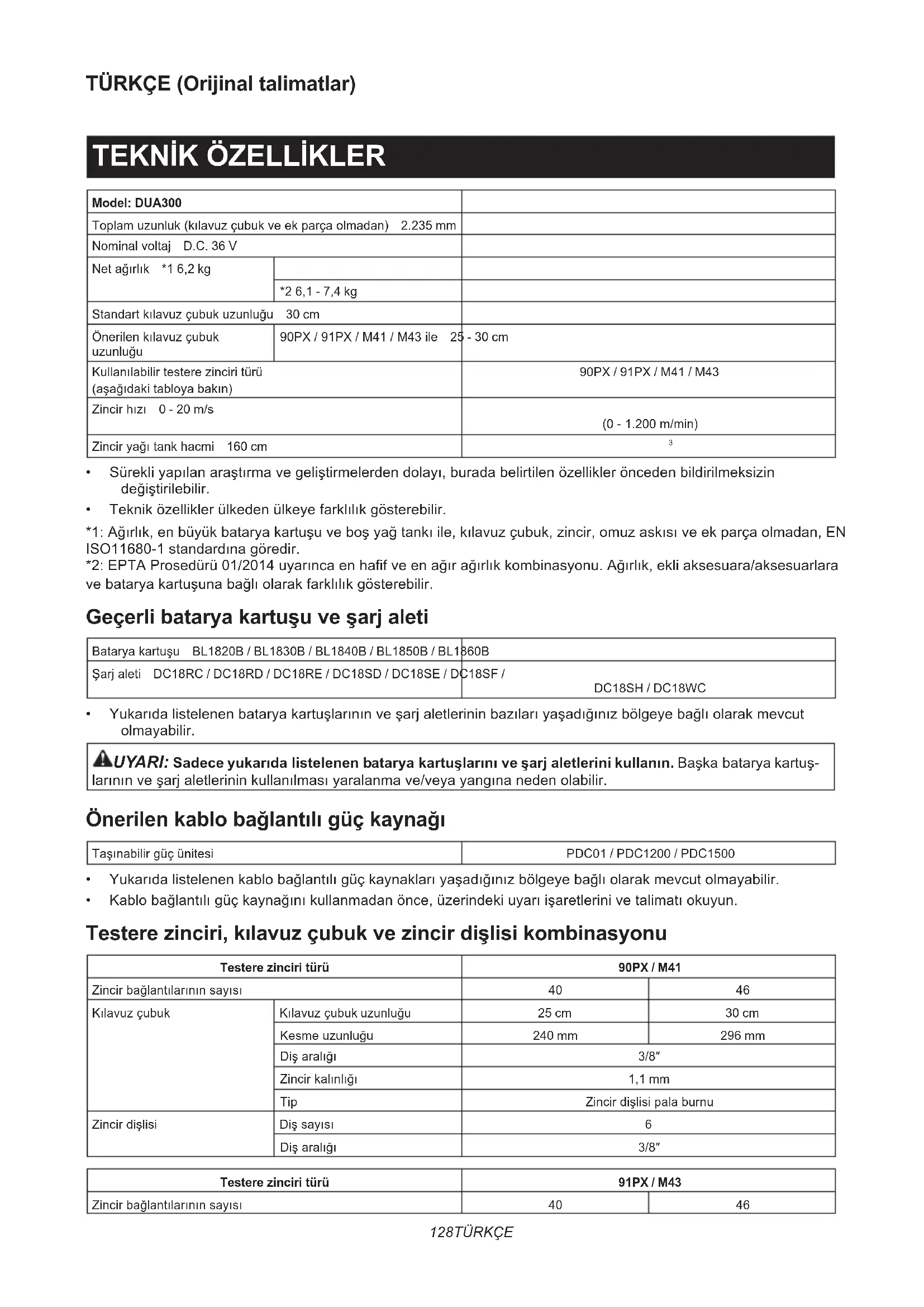 Model: DUA300 Toplamuzunluk(kılavuzçubukveekparçaolmadan) 2.235 mm Nominalvoltaj D.C. 36 V Netağırlık *1 6,2 kg *2 6,1 - 7,4 kg Standartkılavuzçubukuzunluğu 30 cm Önerilenkılavuzçubuk uzunluğu 90PX/91PX/M41/M43ile 25 - 30 cm Kullanılabilirtesterezinciritürü (aşağıdakitabloyabakın) 90PX / 91PX / M41 / M43 Zincirhızı 0 - 20 m/s (0-1.200m/min) Zinciryağıtankhacmi 160 cm
