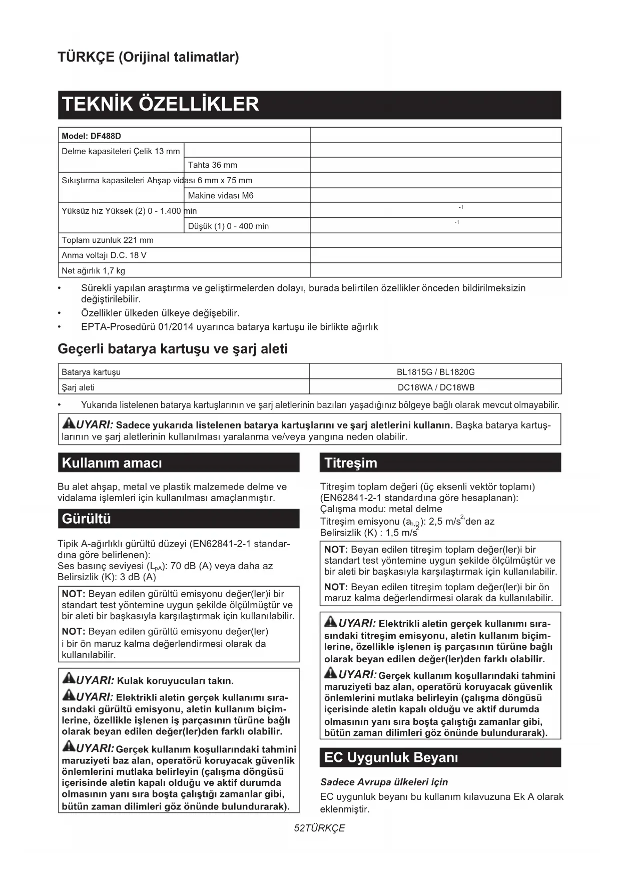 NOT: Beyan edilen titreşim toplam değer(ler)i bir standart test yöntemine uygun şekilde ölçülmüştür ve bir aleti bir başkasıyla karşılaştırmak için kullanılabilir. NOT: Beyan edilen titreşim toplam değer(ler)i bir ön maruz kalma değerlendirmesi olarak da kullanılabilir. UYARI: Elektrikli aletin gerçek kullanımı sıra- sındaki titreşim emisyonu, aletin kullanım biçim- lerine, özellikle işlenen iş parçasının türüne bağlı olarak beyan edilen değer(ler)den farklı olabilir. UYARI: Gerçek kullanım koşullarındaki tahmini maruziyeti baz alan, operatörü koruyacak güvenlik önlemlerini mutlaka belirleyin (çalışma döngüsü içerisinde aletin kapalı olduğu ve aktif durumda olmasının yanı sıra boşta çalıştığı zamanlar gibi, bütün zaman dilimleri göz önünde bulundurarak). EC Uygunluk Beyanı Sadece Avrupa ülkeleri için EC uygunluk beyanı bu kullanım kılavuzuna Ek A olarak eklenmiştir.53 TÜRKÇE