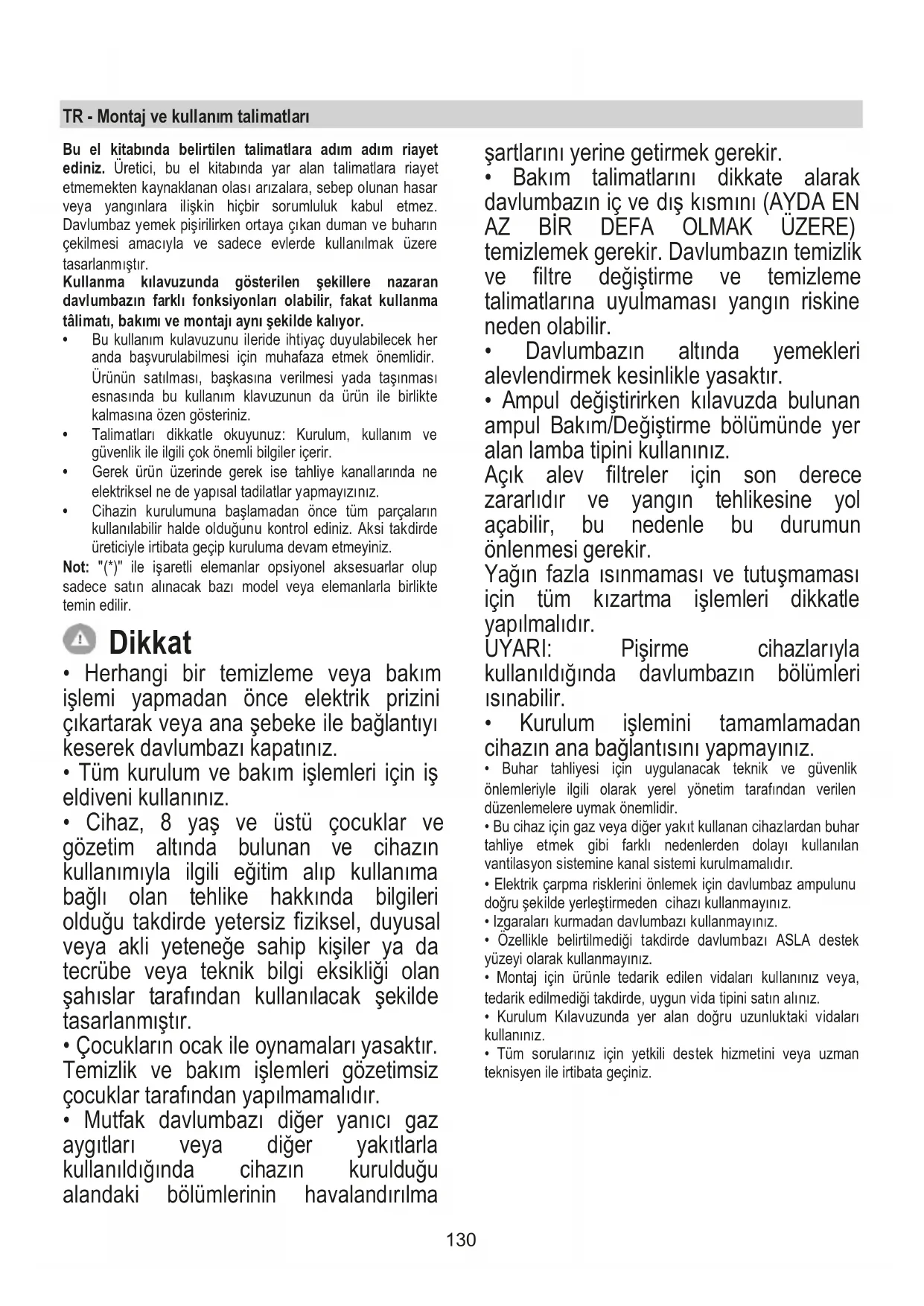 - Ampul de÷iútirirken klavuzda bulunan ampul Bakm/De÷iútirme bölümünde yer alan lamba tipini kullannz. Açk alev filtreler için son derece zararldr ve yangn tehlikesine yol açabilir, bu nedenle bu durumun önlenmesi gerekir. Ya÷n fazla snmamas ve tutuúmamas için tüm kzartma iúlemleri dikkatle yaplmaldr. UYARI: Piúirme cihazlaryla kullanld÷nda davlumbazn bölümleri snabilir.