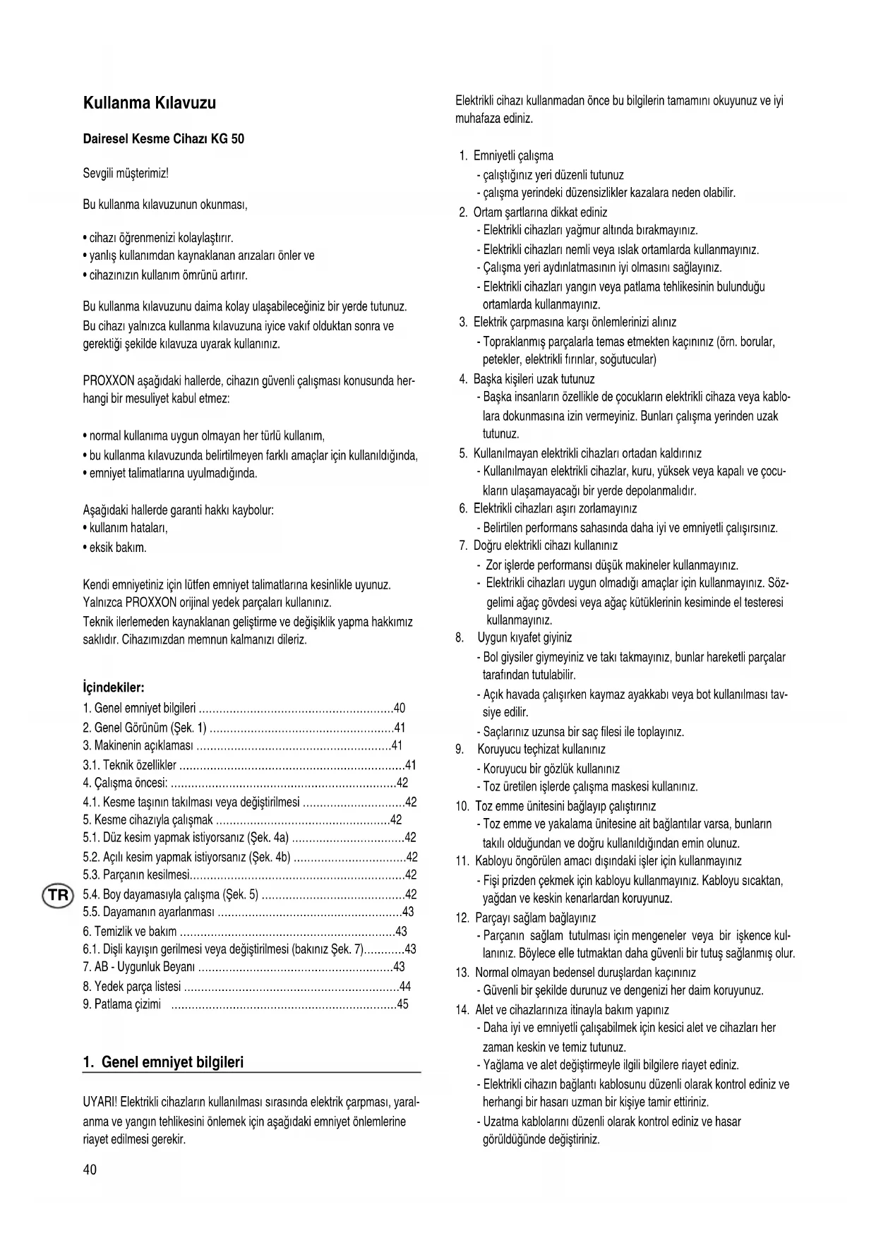 - eksik bakım. Kendi emniyetiniz için lütfen emniyet talimatlarına kesinlikle uyunuz. Yalnızca PROXXON orijinal yedek parçaları kullanınız. Teknik ilerlemeden kaynaklanan gelifltirme ve de¤ifliklik yapma hakkımız saklıdır. Cihazımızdan memnun kalmanızı dileriz. ‹çindekiler: