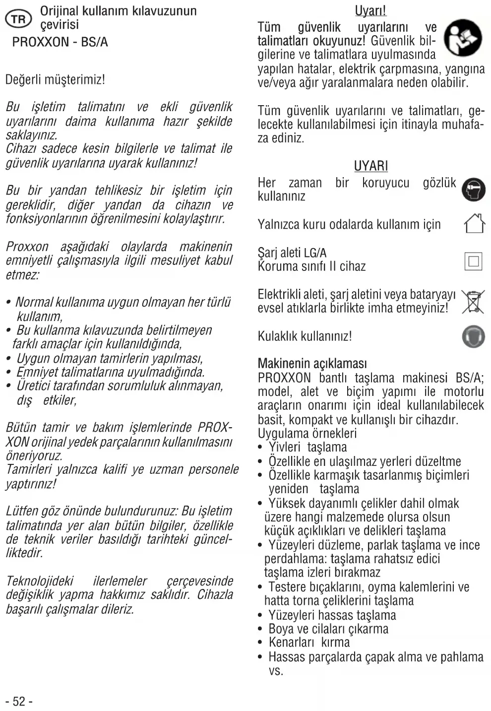 Tüm güvenlik uyarılarını ve Tüm güvenlik uyarılarını ve talimatları okuyunuz! talimatları okuyunuz! Güvenlik bil- gilerine ve talimatlara uyulmasında yapılan hatalar, elektrik çarpmasına, yangına ve/veya ağır yaralanmalara neden olabilir. Tüm güvenlik uyarılarını ve talimatları, ge- lecekte kullanılabilmesi için itinayla muhafa- za ediniz. UYARI UYARI Her zaman bir koruyucu gözlük kullanınız Yalnızca kuru odalarda kullanım için Şarj aleti LG/A Koruma sınıfı II cihaz Elektrikli aleti, şarj aletini veya bataryayı evsel atıklarla birlikte imha etmeyiniz! Kulaklık kullanınız! Makinenin açıklaması Makinenin açıklaması PROXXON bantlı taşlama makinesi BS/A; model, alet ve biçim yapımı ile motorlu araçların onarımı için ideal kullanılabilecek basit, kompakt ve kullanışlı bir cihazdır. Uygulama örnekleri