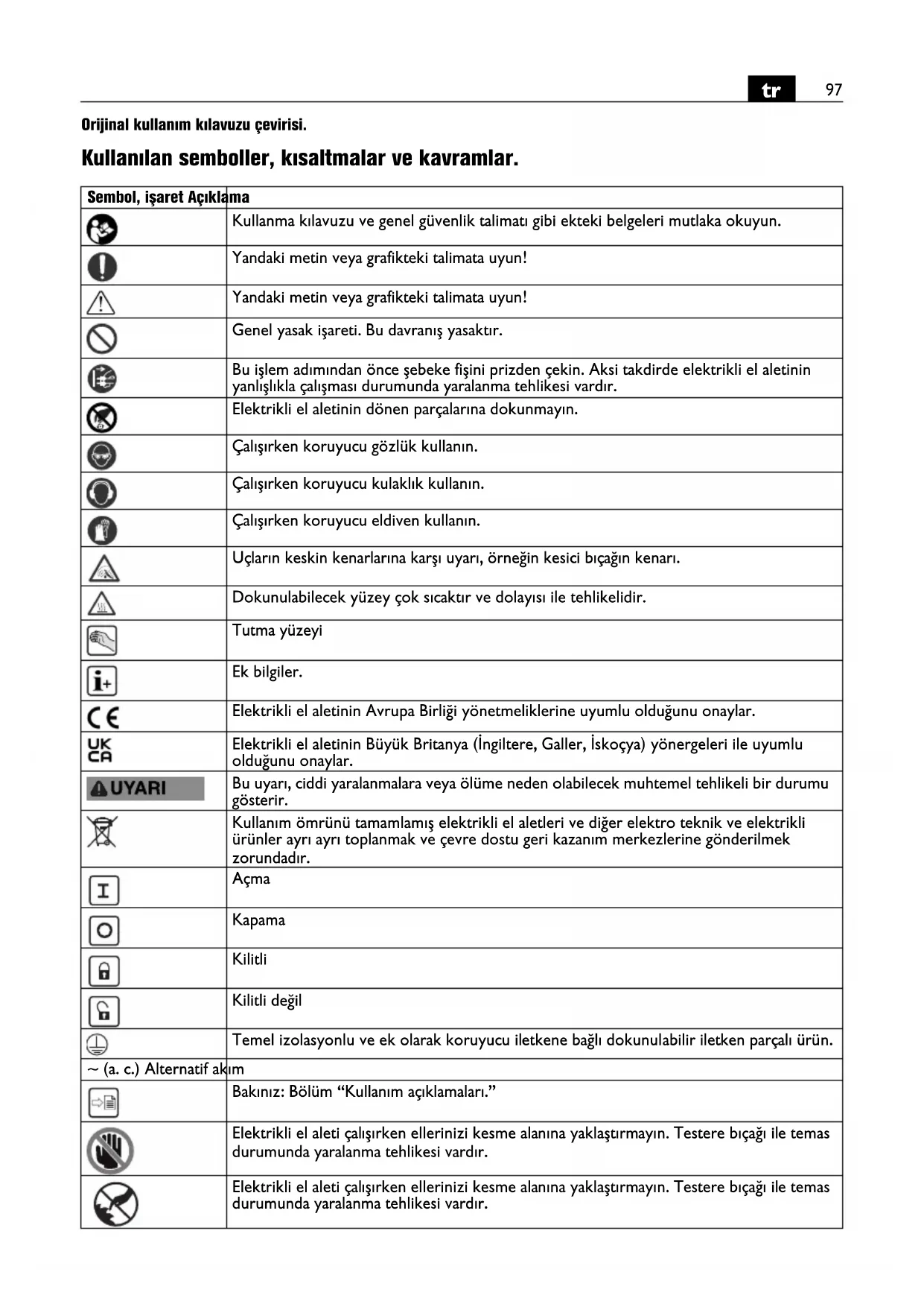 Orijinal kullanım kılavuzu çevirisi. Kullanılan semboller, kısaltmalar ve kavramlar. Sembol, işaret Açıklama Kullanma kılavuzu ve genel güvenlik talimatı gibi ekteki belgeleri mutlaka okuyun. Yandaki metin veya grafikteki talimata uyun! Yandaki metin veya grafikteki talimata uyun! Genel yasak işareti. Bu davranış yasaktır. Bu işlem adımından önce şebeke fişini prizden çekin. Aksi takdirde elektrikli el aletinin yanlışlıkla çalışması durumunda yaralanma tehlikesi vardır. Elektrikli el aletinin dönen parçalarına dokunmayın. Çalışırken koruyucu gözlük kullanın. Çalışırken koruyucu kulaklık kullanın. Çalışırken koruyucu eldiven kullanın. Uçların keskin kenarlarına karşı uyarı, örneğin kesici bıçağın kenarı. Dokunulabilecek yüzey çok sıcaktır ve dolayısı ile tehlikelidir. Tutma yüzeyi Ek bilgiler. Elektrikli el aletinin Avrupa Birliği yönetmeliklerine uyumlu olduğunu onaylar. Elektrikli el aletinin Büyük Britanya (İngiltere, Galler, İskoçya) yönergeleri ile uyumlu olduğunu onaylar. Bu uyarı, ciddi yaralanmalara veya ölüme neden olabilecek muhtemel tehlikeli bir durumu gösterir. Kullanım ömrünü tamamlamış elektrikli el aletleri ve diğer elektro teknik ve elektrikli ürünler ayrı ayrı toplanmak ve çevre dostu geri kazanım merkezlerine gönderilmek zorundadır. Açma Kapama Kilitli Kilitli değil Temel izolasyonlu ve ek olarak koruyucu iletkene bağlı dokunulabilir iletken parçalı ürün. ~ (a. c.) Alternatif akım Bakınız: Bölüm “Kullanım açıklamaları.” Elektrikli el aleti çalışırken ellerinizi kesme alanına yaklaştırmayın. Testere bıçağı ile temas durumunda yaralanma tehlikesi vardır. Elektrikli el aleti çalışırken ellerinizi kesme alanına yaklaştırmayın. Testere bıçağı ile temas durumunda yaralanma tehlikesi vardır.98
