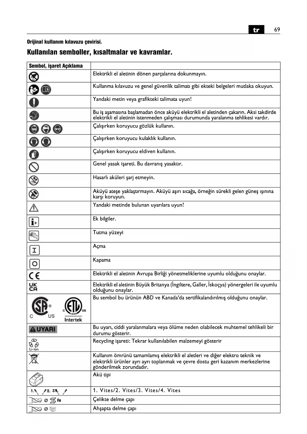 Orijinal kullanım kılavuzu çevirisi. Kullanılan semboller, kısaltmalar ve kavramlar. Sembol, işaret Açıklama Elektrikli el aletinin dönen parçalarına dokunmayın. Kullanma kılavuzu ve genel güvenlik talimatı gibi ekteki belgeleri mutlaka okuyun. Yandaki metin veya grafikteki talimata uyun! Bu iş aşamasına başlamadan önce aküyü elektrikli el aletinden çakarın. Aksi takdirde elektrikli el aletinin istenmeden çalışması durumunda yaralanma tehlikesi vardır. Çalışırken koruyucu gözlük kullanın. Çalışırken koruyucu kulaklık kullanın. Çalışırken koruyucu eldiven kullanın. Genel yasak işareti. Bu davranış yasaktır. Hasarlı aküleri şarj etmeyin. Aküyü ateşe yaklaştırmayın. Aküyü aşırı sıcağa, örneğin sürekli gelen güneş ışınına karşı koruyun. Yandaki metinde bulunan uyarılara uyun! Ek bilgiler. Tutma yüzeyi Açma Kapama Elektrikli el aletinin Avrupa Birliği yönetmeliklerine uyumlu olduğunu onaylar. Elektrikli el aletinin Büyük Britanya (İngiltere, Galler, İskoçya) yönergeleri ile uyumlu olduğunu onaylar. Bu sembol bu ürünün ABD ve Kanada’da sertifikalandırılmış olduğunu onaylar. Bu uyarı, ciddi yaralanmalara veya ölüme neden olabilecek muhtemel tehlikeli bir durumu gösterir. Recycling işareti: Tekrar kullanılabilen malzemeyi gösterir Kullanım ömrünü tamamlamış elektrikli el aletleri ve diğer elektro teknik ve elektrikli ürünler ayrı ayrı toplanmak ve çevre dostu geri kazanım merkezlerine gönderilmek zorundadır. Akü tipi