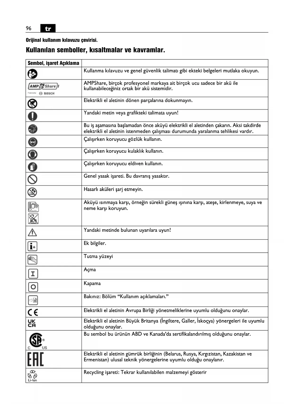 Orijinal kullanım kılavuzu çevirisi. Kullanılan semboller, kısaltmalar ve kavramlar. Sembol, işaret Açıklama Kullanma kılavuzu ve genel güvenlik talimatı gibi ekteki belgeleri mutlaka okuyun. AMPShare, birçok profesyonel markaya ait birçok ucu sadece bir akü ile kullanabileceğiniz ortak bir akü sistemidir. Elektrikli el aletinin dönen parçalarına dokunmayın. Yandaki metin veya grafikteki talimata uyun! Bu iş aşamasına başlamadan önce aküyü elektrikli el aletinden çakarın. Aksi takdirde elektrikli el aletinin istenmeden çalışması durumunda yaralanma tehlikesi vardır. Çalışırken koruyucu gözlük kullanın. Çalışırken koruyucu kulaklık kullanın. Çalışırken koruyucu eldiven kullanın. Genel yasak işareti. Bu davranış yasaktır. Hasarlı aküleri şarj etmeyin. Aküyü ısınmaya karşı, örneğin sürekli güneş ışınına karşı, ateşe, kirlenmeye, suya ve neme karşı koruyun. Yandaki metinde bulunan uyarılara uyun! Ek bilgiler. Tutma yüzeyi Açma Kapama Bakınız: Bölüm “Kullanım açıklamaları.” Elektrikli el aletinin Avrupa Birliği yönetmeliklerine uyumlu olduğunu onaylar. Elektrikli el aletinin Büyük Britanya (İngiltere, Galler, İskoçya) yönergeleri ile uyumlu olduğunu onaylar. Bu sembol bu ürünün ABD ve Kanada’da sertifikalandırılmış olduğunu onaylar. Elektrikli el aletinin gümrük birliğinin (Belarus, Rusya, Kırgızistan, Kazakistan ve Ermenistan) ulusal teknik yönergelerine uyumlu olduğu onaylanır. Recycling işareti: Tekrar kullanılabilen malzemeyi gösterir max.50°C97