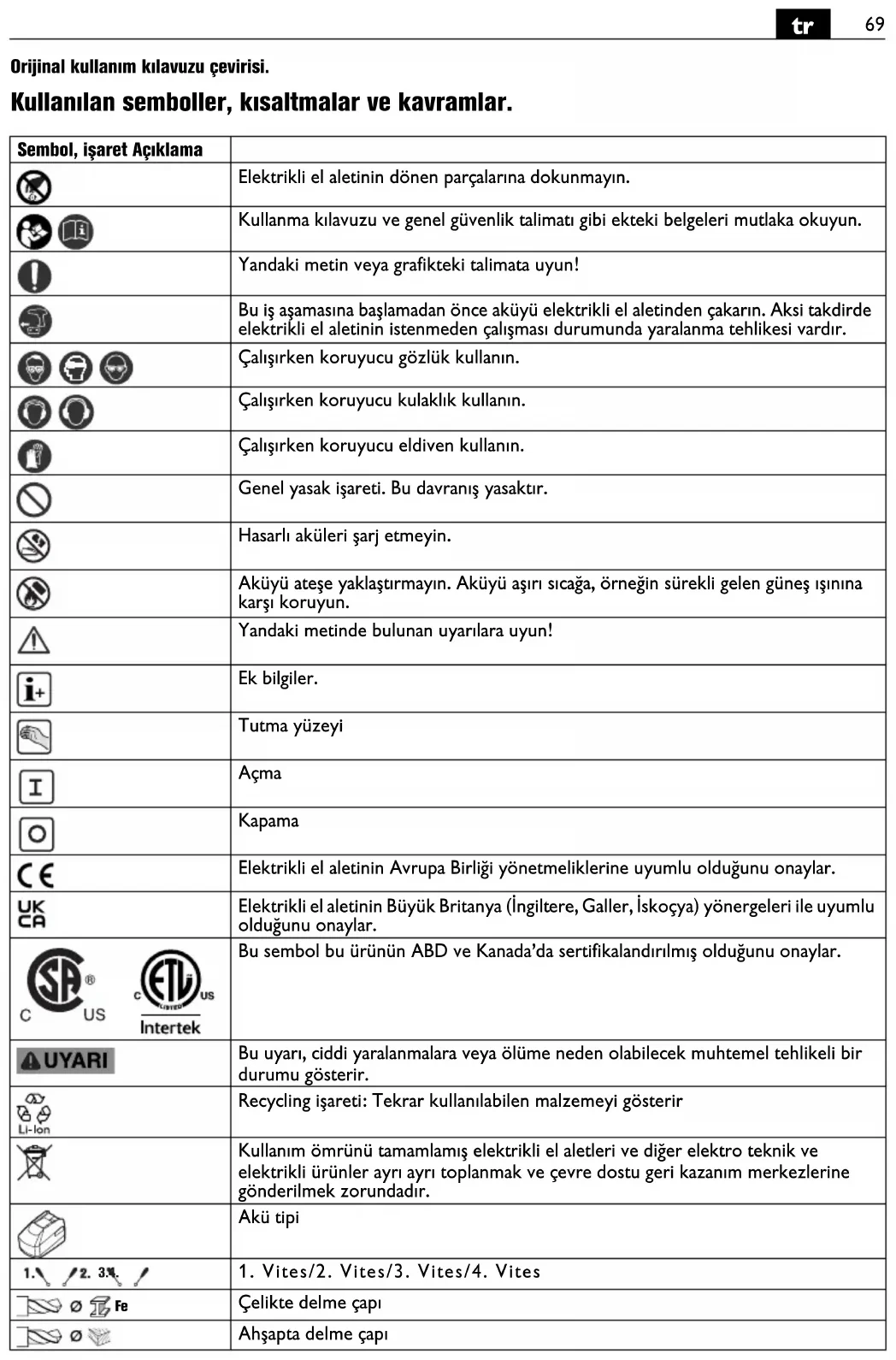 Orijinal kullanım kılavuzu çevirisi. Kullanılan semboller, kısaltmalar ve kavramlar. Sembol, işaret Açıklama Elektrikli el aletinin dönen parçalarına dokunmayın. Kullanma kılavuzu ve genel güvenlik talimatı gibi ekteki belgeleri mutlaka okuyun. Yandaki metin veya grafikteki talimata uyun! Bu iş aşamasına başlamadan önce aküyü elektrikli el aletinden çakarın. Aksi takdirde elektrikli el aletinin istenmeden çalışması durumunda yaralanma tehlikesi vardır. Çalışırken koruyucu gözlük kullanın. Çalışırken koruyucu kulaklık kullanın. Çalışırken koruyucu eldiven kullanın. Genel yasak işareti. Bu davranış yasaktır. Hasarlı aküleri şarj etmeyin. Aküyü ateşe yaklaştırmayın. Aküyü aşırı sıcağa, örneğin sürekli gelen güneş ışınına karşı koruyun. Yandaki metinde bulunan uyarılara uyun! Ek bilgiler. Tutma yüzeyi Açma Kapama Elektrikli el aletinin Avrupa Birliği yönetmeliklerine uyumlu olduğunu onaylar. Elektrikli el aletinin Büyük Britanya (İngiltere, Galler, İskoçya) yönergeleri ile uyumlu olduğunu onaylar. Bu sembol bu ürünün ABD ve Kanada’da sertifikalandırılmış olduğunu onaylar. Bu uyarı, ciddi yaralanmalara veya ölüme neden olabilecek muhtemel tehlikeli bir durumu gösterir. Recycling işareti: Tekrar kullanılabilen malzemeyi gösterir Kullanım ömrünü tamamlamış elektrikli el aletleri ve diğer elektro teknik ve elektrikli ürünler ayrı ayrı toplanmak ve çevre dostu geri kazanım merkezlerine gönderilmek zorundadır. Akü tipi