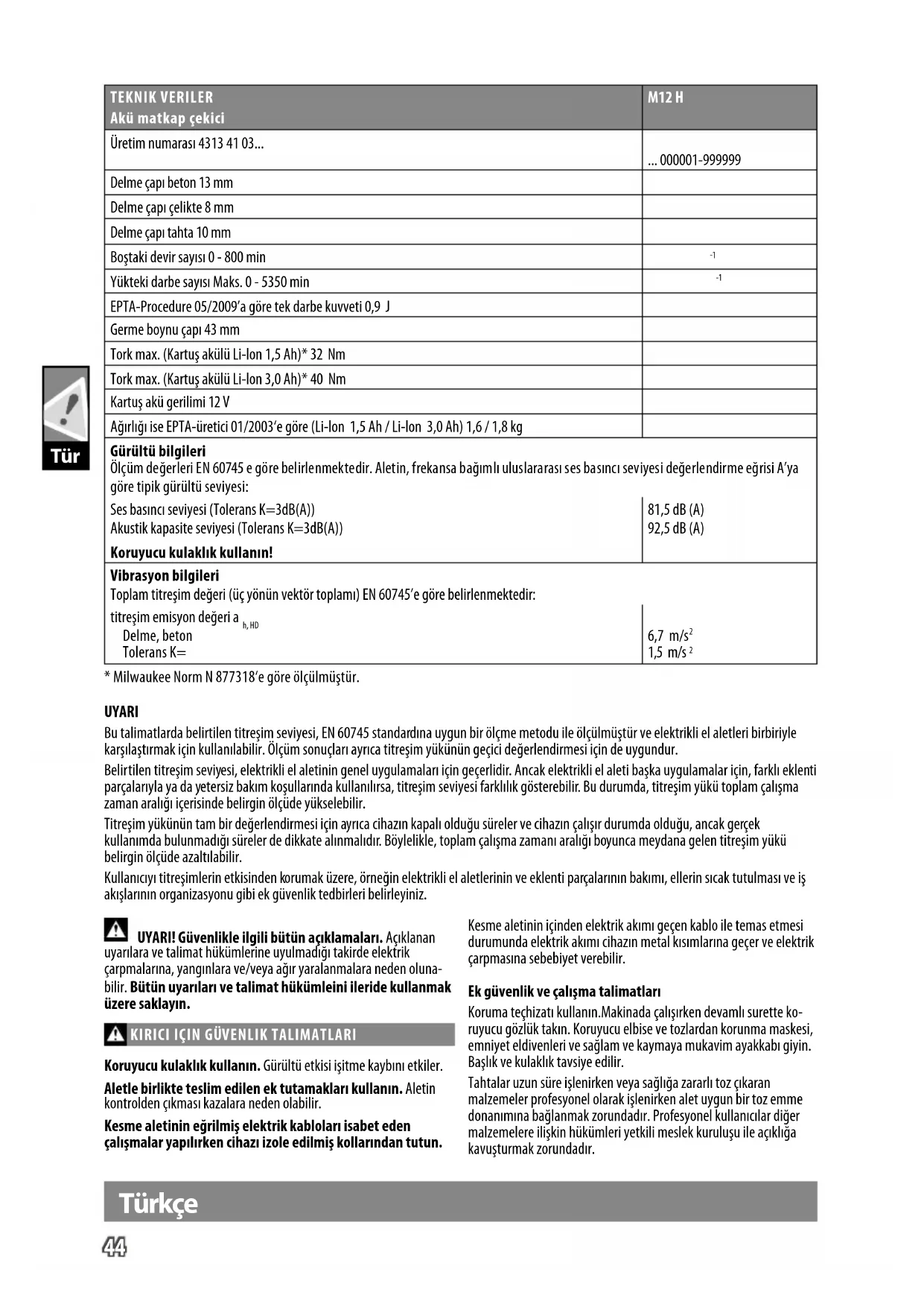 Koruyucu kulaklık kullanın. Gürültü etkisi işitme kaybını etkiler. Aletle birlikte teslim edilen ek tutamakları kullanın. Aletin kontrolden çıkması kazalara neden olabilir. Kesme aletinin eğrilmiş elektrik kabloları isabet eden çalışmalar yapılırken cihazı izole edilmiş kollarından tutun. Kesme aletinin içinden elektrik akımı geçen kablo ile temas etmesi durumunda elektrik akımı cihazın metal kısımlarına geçer ve elektrik çarpmasına sebebiyet verebilir. Ek güvenlik ve çalışma talimatları Koruma teçhizatı kullanın.Makinada çalışırken devamlı surette ko- ruyucu gözlük takın. Koruyucu elbise ve tozlardan korunma maskesi, emniyet eldivenleri ve sağlam ve kaymaya mukavim ayakkabı giyin. Başlık ve kulaklık tavsiye edilir. Tahtalar uzun süre işlenirken veya sağlığa zararlı toz çıkaran malzemeler profesyonel olarak işlenirken alet uygun bir toz emme donanımına bağlanmak zorundadır. Profesyonel kullanıcılar diğer malzemelere ilişkin hükümleri yetkili meslek kuruluşu ile açıklığa kavuşturmak zorundadır. TEKNIK VERILER Akü matkap çekici M12 H Üretim numarası 4313 41 03... ... 000001-999999 Delme çapı beton 13 mm Delme çapı çelikte 8 mm Delme çapı tahta 10 mm Boştaki devir sayısı 0 - 800 min