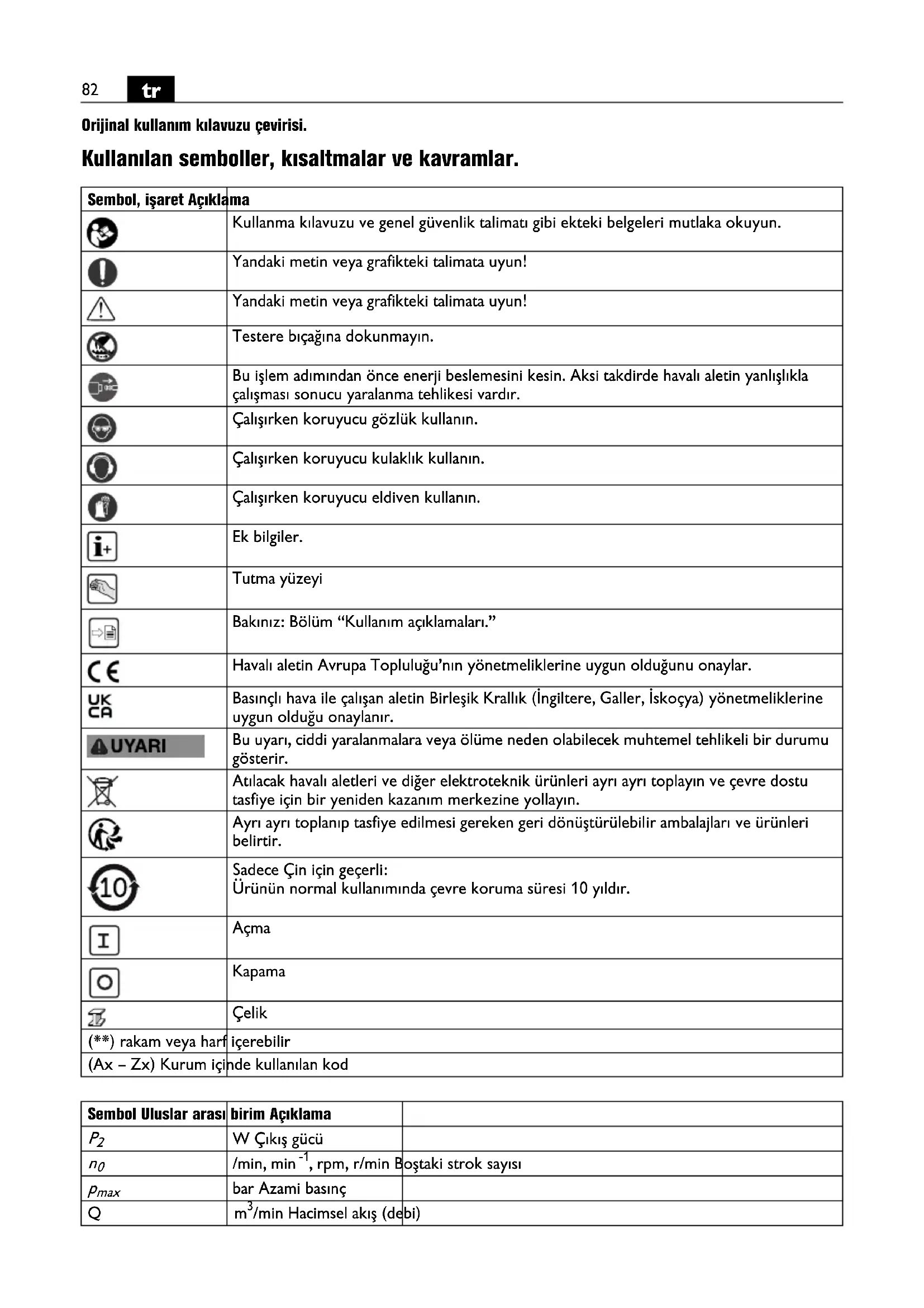 Orijinal kullanım kılavuzu çevirisi. Kullanılan semboller, kısaltmalar ve kavramlar. Sembol, işaret Açıklama Kullanma kılavuzu ve genel güvenlik talimatı gibi ekteki belgeleri mutlaka okuyun. Yandaki metin veya grafikteki talimata uyun! Yandaki metin veya grafikteki talimata uyun! Testere bıçağına dokunmayın. Bu işlem adımından önce enerji beslemesini kesin. Aksi takdirde havalı aletin yanlışlıkla çalışması sonucu yaralanma tehlikesi vardır. Çalışırken koruyucu gözlük kullanın. Çalışırken koruyucu kulaklık kullanın. Çalışırken koruyucu eldiven kullanın. Ek bilgiler. Tutma yüzeyi Bakınız: Bölüm “Kullanım açıklamaları.” Havalı aletin Avrupa Topluluğu’nın yönetmeliklerine uygun olduğunu onaylar. Basınçlı hava ile çalışan aletin Birleşik Krallık (İngiltere, Galler, İskoçya) yönetmeliklerine uygun olduğu onaylanır. Bu uyarı, ciddi yaralanmalara veya ölüme neden olabilecek muhtemel tehlikeli bir durumu gösterir. Atılacak havalı aletleri ve diğer elektroteknik ürünleri ayrı ayrı toplayın ve çevre dostu tasfiye için bir yeniden kazanım merkezine yollayın. Ayrı ayrı toplanıp tasfiye edilmesi gereken geri dönüştürülebilir ambalajları ve ürünleri belirtir. Sadece Çin için geçerli: Ürünün normal kullanımında çevre koruma süresi 10 yıldır. Açma Kapama Çelik (**) rakam veya harf içerebilir (Ax – Zx) Kurum içinde kullanılan kod Sembol Uluslar arası birim Açıklama