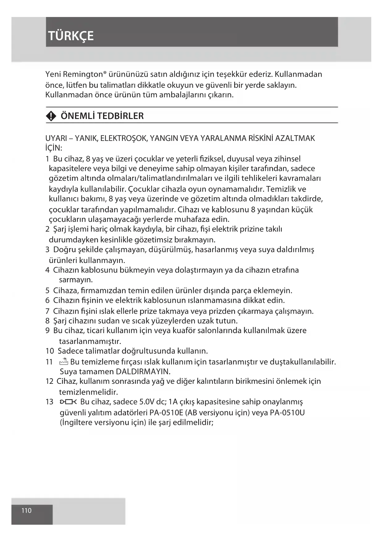 Yeni Remington® ürününüzü satın aldığınız için teşekkür ederiz. Kullanmadan önce, lütfen bu talimatları dikkatle okuyun ve güvenli bir yerde saklayın. Kullanmadan önce ürünün tüm ambalajlarını çıkarın.