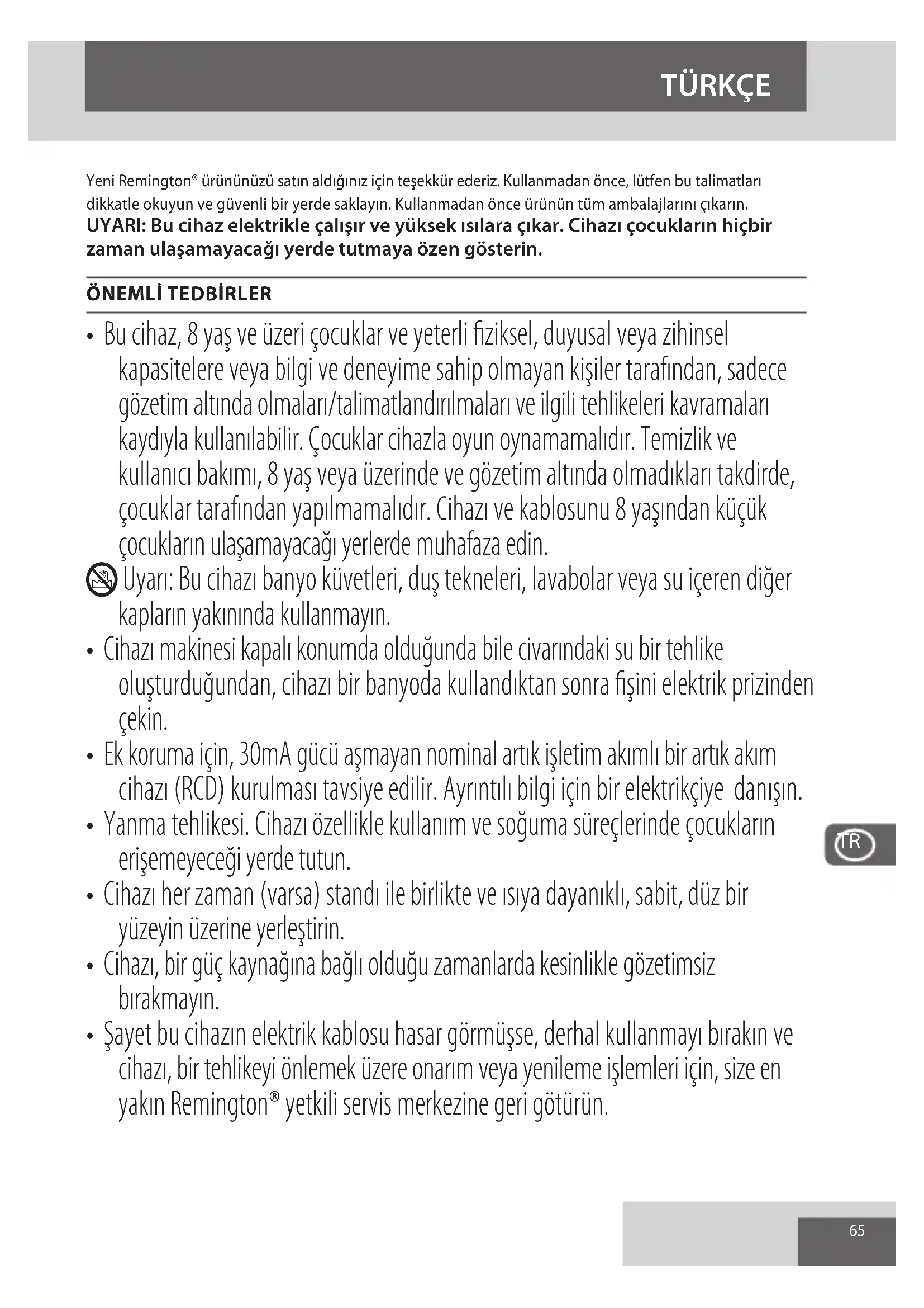 - Şayet bu cihazın elektrik kablosu hasar görmüşse, derhal kullanmayı bırakın ve cihazı, bir tehlikeyi önlemek üzere onarım veya yenileme işlemleri için, size en yakın Remington® yetkili servis merkezine geri götürün.