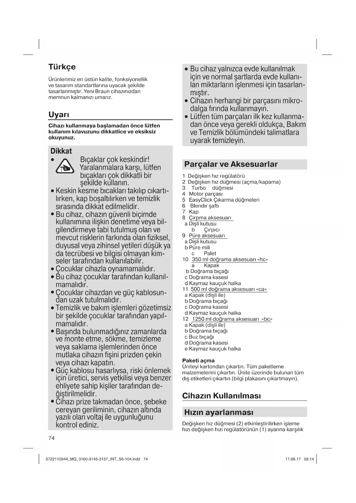 Lütfen tüm parçaları ilk kez kullanma- dan önce veya gerekli oldukça, Bakım ve Temizlik bölümündeki talimatlara uyarak temizleyin. Parçalar ve Aksesuarlar 1 Değişken hız regülatörü 2 Değişken hız düğmesi (açma/kapama) 3 Turbo düğmesi 4 Motor parçası 5 EasyClick Çıkarma düğmeleri 6 Blendır şaftı 7 Kap 8 Çırpma aksesuarı a Dişli kutusu b Çırpıcı 9 Püre aksesuarı a Dişli kutusu b Püre mili c Palet 10 350 ml doğrama aksesuarı «hc» a Kapak b Doğrama bıçağı c Doğrama kasesi d Kaymaz kauçuk halka 11 500 ml doğrama aksesuarı «ca» a Kapak (dişli ile) b Doğrama bıçağı c Doğrama kasesi d Kaymaz kauçuk halka 12 1250 ml doğrama aksesuarı «bc» a Kapak (dişli ile) b Doğrama bıçağı c Buz bıçağı d Doğrama kasesi e Kaymaz kauçuk halka Paketi açma Üniteyi kartondan çıkartın. Tüm paketleme malzemelerini çıkartın. Ünite üzerinde bulunan tüm dış etiketleri çıkartın (bilgi plakasını çıkartmayın). Cihazın Kullanılması Hızın ayarlanması Değişken hız düğmesi (2) etkinleştirilirken işleme hızı değişken hızı regülatörünün (1) ayarına karşılık 5722112944_MQ_3100-3145-3137_INT_S6-104.indd 745722112944_MQ_3100-3145-3137_INT_S6-104.indd 74 17.08.17 09:1417.08.17 09:1475 gelir. Ayar ne kadar yüksek olursa doğrama o kadar hızlı sonuçlanır. İşlem esnasında hız regülatörünü döndürerek hızı kolaylıkla ayarlayabilirsiniz. Maksimum işleme hızına, turbo düğmesine (3) basarak ulaşılabilir. Ayrıca, hız regülatörünü kullanmak zorunda kalmadan ani ve güçlü darbeler için Turbo düğmesini kullanabilirsiniz. Karıştırma Mili (A) El blenderi meze, sos, salata sosu, çorba, bebek maması ile içecek, meyve püresi ve milkshake hazırlamaya da çok uygundur. En iyi sonuçlar için Turbo hızı kullanın. Takma ve Çalıştırma