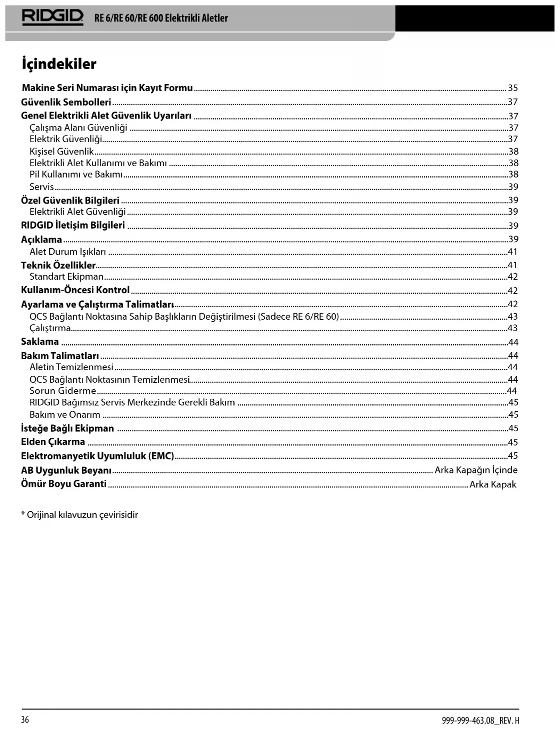999-999-463.08_REV. HRIDGID Bağımsız Servis Merkezinde Gerekli Bakım Düzgün çalıştığından emin olmak için Elektrikli alet belirle-nen aralıklarda bir RIDGID Bağımsız Servis Merkezi tarafın-dan servi edilmelidir Bu alet durum ışığı tarafından gösteri-lecektir (Bkz. Şekil 6) Servis aralığı için Teknik Özelliklere bakın Bakım ve Onarım UYARI Hatalı servis ve tamir makinenin çalışmasını güvensiz kılabilir.Bu Elektrikli Aletler üzerindeki servis ve onarım bir RIDGID Bağımsız Sıkma Aleti Servis Merkezi tarafından yapılmalıdır Sadece RIDGID servis parçaları kullanınSize en yakın RIDGID Bağımsız Servis Merkezi hakkında bil-gi veya servis ya da onarımla ilgili sorularınız için bu kılavuz-daki İletişim Bilgileri bölümüne bakın İsteğe Bağlı Ekipman UYARI Ciddi yaralanma riskini azaltmak için aşağıda listele-nenler gibi sadece RIDGID Elektrikli Aletleri için özel tasarlanan ve önerilen ekipmanları kullanın.RE 6/RE 60/RE 600 Serisi Katalog No. Açıklama44693 18V 2.0Ah Pil (Kuzey & Latin Amerika, Avustralya)44698 18V 4.0Ah Pil (Kuzey & Latin Amerika, Avustralya)43458 120V Gelişmiş Lityum Pil Şarj Aleti43333 230V Gelişmiş Lityum Pil Şarj Aleti43323 18V 2.0Ah Pil (Avrupa & Çin)43328 18V 4.0Ah Pil (Avrupa & Çin)RE 6/RE 60 Serisi Katalog No. Açıklama52283 4P-6 4PIN™ Kalıpsız Sıkıştırma Başlığı52078 Swiv-L-Zımba İtme Zımba Başlığı47198 SC-60C Bakır/Alüminyum Tel için Kesme Kafası49408 SC-60C ACSR için Kesme Kafası52083 RE 6 Taşıma Çantası (Plastik)47773 RE 60 Taşıma Çantası (Plastik)47753 LR-60B Mandal Yuvarlak BaşlığıBu aletler için mevcut olan RIDGID ekipmanların tam bir listesi için RIDGIDcom adresinden çevrim için Ridge Tool Kataloğuna bakın veya İletişim Bilgilerine bakın Elden Çıkarma Elektrikli Aletin parçaları değerli malzemeler içermektedir ve geri dönüşüme tabi tutulmalıdır Bulunduğunuz bölge-de geri dönüşüm konusunda uzmanlaşmış şirketler bulu-nabilir Parçaları geçerli düzenlemelere göre elden çıkarın Daha fazla bilgi için yerel yetkili atık yönetimi birimi ile ile-tişim kurun AT Ülkeleri için: Elektrikli cihazları ev atıkları ile birlikte atmayın!Atık Elektrikli ve Elektronik Cihazlar için Avrupa Yönergesi 2012/19/EU ve yerel mevzuata uy-gulanmasına göre, kullanılamayacak durum-daki elektrikli cihazlar ayrı olarak toplanmalı ve çevreye zarar vermeyecek şekilde elden çıkarılmalıdır Elektromanyetik Uyumluluk (EMC) Elektromanyetik uyumluluk terimi, elektromanyetik yayıl-ma ve elektrostatik boşalmaların bulunduğu ortamlarda ve diğer ekipmanlarda elektromanyetik parazite neden olma-dan ürünün, sorunsuz olarak çalışması anlamına gelirRIDGID RE 6/RE 60/RE 600 Ailesi Elektrikli Aletleri IEC61000-6-5 (Ed 10) Elektromanyetik Uyumluluk (EMC) Bölüm 6-5: Genel Standartlar - Güç İstasyonu ve Trafo Merkezinde Kul-lanılan Donanımlara Karşı Bağışıklık'a uygundurBİLDİRİM Bu aletler tüm geçerli EMC standartlarına uy-gundur Ancak diğer cihazlarda parazite neden olma ihti-mali önlenemez Tüm EMC ile ilgili test edilmiş standartlar aletin teknik belgelerinde belirtilmiştir RE 6/RE 60/RE 600 Elektrikli Aletler