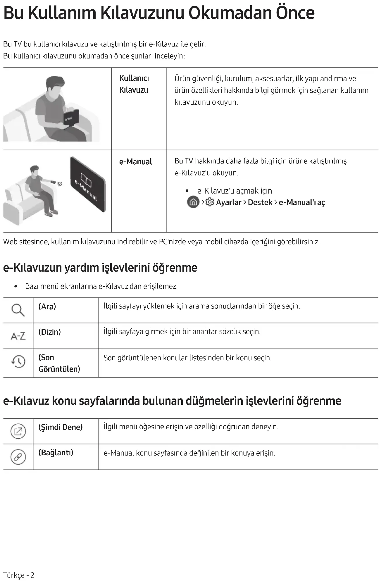 - Bazı menü ekranlarına e-Kılavuz'dan erişilemez. (Ara) İlgili sayfayı yüklemek için arama sonuçlarından bir öğe seçin. (Dizin) İlgili sayfaya girmek için bir anahtar sözcük seçin. (Son Görüntülen) Son görüntülenen konular listesinden bir konu seçin. e-Kılavuz konu sayfalarında bulunan düğmelerin işlevlerini öğrenme (Şimdi Dene) İlgili menü öğesine erişin ve özelliği doğrudan deneyin. (Bağlantı) e-Manual konu sayfasında değinilen bir konuya erişin.Türkçe - 3 Türkçe Uyarı! Önemli Güvenlik Talimatları TV'nizi kullanmadan önce lütfen Güvenlik Talimatlarını okuyun. DİKKAT Sınıf II ürün: Bu sembol, elektrik topraklamasına (toprak) bir güvenlik bağlantısı gerekmediğini gösterir. ELEKTRİK ÇARPMASI RİSKİ. AÇMAYIN. DİKKAT: ELEKTRİK ÇARPMASI RİSKİNİ AZALTMAK