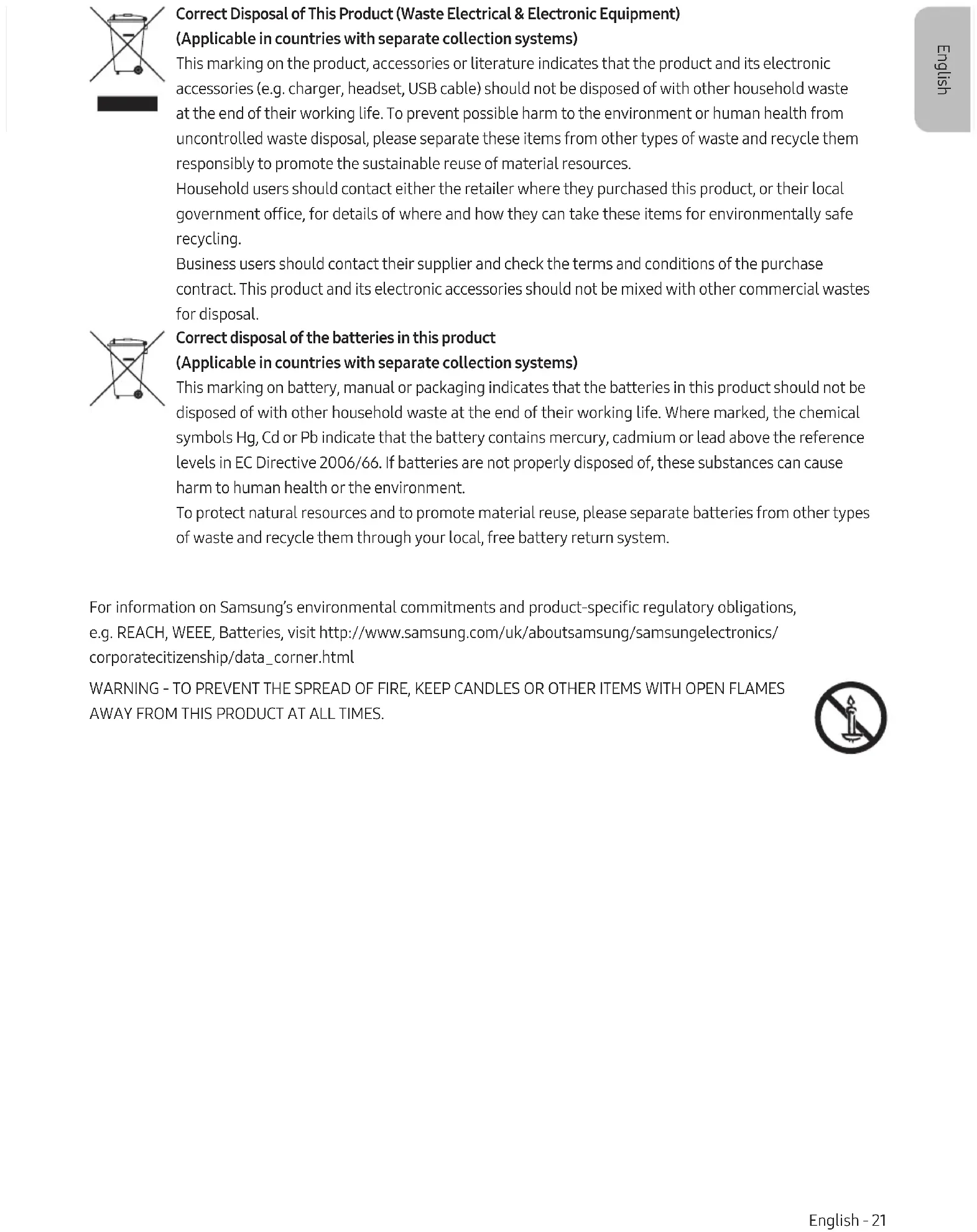 - Tipik güç tüketimi IEC 62087'ye göre ölçülmüştür. Güç tüketimini azaltma TV'yi kapattığınızda, Bekleme moduna girer. Bekleme modunda, küçük bir miktar güç çekmeye devam eder. TV'yi uzun süre kullanmayı düşünmüyorsanız, güç tüketimini azaltmak için güç kablosunu şten çıkarın. Lisanslar The terms HDMI and HDMI High-Denition Multimedia Interface, and the HDMI Logo are trademarks or registered trademarks of HDMI Licensing LLC in the United States and other countries. Öneri - Yalnızca AB İşbu belge ile Samsung Electronics, bu TV'nin 1999/5/EC Direktinin esas gerekliliklerine ve diğer ilgili hükümlerine uygun olduğunu beyan eder. Resmi Uyumluluk Beyanı http://www.samsung.com adresinde bulunabilir; Destek > Ürün Desteği Ara bölümüne gidin ve model adını girin. Bu ekipman, yalnızca iç mekanlarda kullanılabilir. Bu ekipman, tüm AB ülkelerinde çalıştırılabilir. Türkçe - 20 Türkçe - 21Bu Ürünün Doğru Şekilde Elden Çıkarılması (Atık Elektrikli ve Elektronik Aletler) (Ayrı toplama sistemleri olan ülkeler içindir) Ürün, aksesuarlar veya kitapçık üzerindeki bu işaret, ürünün ve elektronik aksesuarlarının (örn. şarj cihazı, kulaklık, USB kablosu) kullanım süresi sonunda diğer ev atıkları ile birlikte atılmaması gerektiğini belirtir. Atıkların kontrolsüz şekilde elden çıkarılmasından doğabilecek çevre ve insan sağlığı üzerindeki olası zararları önlemek için, lütfen bu ürünleri diğer atık türlerinden ayırın ve sorumlu davranarak malzeme kaynaklarının sürdürülebilir yeniden kullanımını kolaylaştırın. Ürünü evde kullananlar, bu ürünlerin çevreye dost şekilde geri dönüşümünü sağlamakla ilgili ayrıntılar için ürünü satın aldıkları bayi ya da yerel yönetim osleriyle irtibat kurmalıdır. Ticari kullanıcılar tedarikçilerine başvurmalı ve satın alma sözleşmesinin hüküm ve koşullarını kontrol etmelidir. Bu ürün ve elektronik aksesuarlar, elden çıkarılırken diğer ticari atıklarla karıştırılmamalıdır. Bu üründeki pilleri doğru şekilde elden çıkarma (Ayrı toplama sistemleri olan ülkeler içindir) Pil, kılavuz veya ambalaj üzerindeki bu işaret, bu üründeki pillerin kullanım süresi sonunda diğer ev atıkları ile birlikte atılmaması gerektiğini belirtir. Belirtildiği durumda, Hg, Cd veya Pb kimyasal sembolleri pilin EC Direkti 2006/66'daki referans seviyelere göre yüksek civa, kadmiyum ve kurşun içerdiğini gösterir. Piller doğru şekilde çöpe atılmazlarsa, bu maddeler insan sağlığına ya da çevreye zarar verebilir. Doğal kaynakları korumak ve malzeme yeniden kullanımını desteklemek için, lütfen pilleri diğer atık türlerinden ayırın ve bölgenizdeki boş pil geri dönüş sistemi ile geri dönüştürün. Samsung’un çevre taahhütleri ve REACH, WEEE, Piller gibi ürüne özel mevzuat yükümlülükleri hakkında bilgi için bkz. http://www.samsung.com/uk/aboutsamsung/samsungelectronics/corporatecitizenship/data_corner.html UYARI - YANGININ YAYILMASINI ÖNLEMEK İÇİN, MUMLARI VEYA AÇIK ALEV İÇEREN DİĞER ÖĞELERİ BU ÜRÜNDEN HER ZAMAN UZAK TUTUN. Türkçe - 20 Türkçe - 21 TürkçeSAMSUNG Electronics İstanbul Pazarlama ve Ticaret LTD.ŞTİ. Flatos İstanbul İş Merkezi,Otakçılar Cad. Bina No: 78, Kat:3, No: B3, 34050, Eyüp, İstanbul /Türkiye Tel: (0212) 467 06 00 AEEE Yönetmeliğine Uygundur Bu ürünün ortalama yaşam süresi 10 yıldır. İmalatçı SAMSUNG ELECTRONICS CO., LTD. (Maetan dong) 129, Samsung-ro Yeongtong-gu, Suwon-si, Gyeonggi-do 443-742, Korea Tel: +82-2-2255-0114 / Fax: +82-2-2255-0117 LVD Korea Testing Laboratory (KTL) Nemko Korea Co., Ltd. UL (Demko) Korea, Ltd. TÜV Rheinland Korea Ltd. EMC DT&C Co., Ltd. KCTL Inc. CTK Co., Ltd. ONETECH Corp. Nemko Korea Co., Ltd. SGS Korea Co., Ltd. CS & Environment Centre of Samsung Electronics Co., Ltd. Korea Testing Laboratory (KTL) 87, Digital-ro 26-gil, Guro-gu, Seoul 152-718 KOREA, REPUBLIC OF Tel: + 82-2-860-1309 UL (Demko) Korea, Ltd. #808, Manhatan Building, 36-2 Yeouido-Dong, Yeongdeungpo-Gu, Seoul 150-749, Korea Tel: + 82-2-2009-9100 TÜV Rheinland Korea Ltd. Test Center 4F, E&C Venture Dream Tower 6, 197-28, Guro-dong, Guro-gu 152-719 Seoul KOREA, REPUBLIC OF Tel: + 82-2-860-9941 DT&C Co., Ltd. 42, Yurim-ro, 154 beon-gil, Cheoin-gu, Yongin-si, Gyeonggi-do, 449-935, Korea Tel: + 82-31-321-2664 KCTL Inc. 65, Sinwon-ro, Yeongtong-gu, Suwon-si, Gyeonggi-do, 443-390, Korea Tel: + 82-70-5008-1021 CTK Co., Ltd. 113, Yejik-ro, Cheoin-gu, Yongin-si, Gyeonggi-do, Korea Tel: + 82-31-339-9970 ONETECH Corp. 43-14, Jinsaegol-gil, Chowol-eup, Gwangju-si, Gyeonggi-do 464-862 Korea (301-14 Daessangnyeong-ri) Tel: + 82-31-799-9500 Nemko Korea Co., Ltd. 153, Osan-Ro, Mohyeon-Myeon, Cheoin-Gu, Yongin-Si, Gyeonggi-Do 449-852 KOREA, REPUBLIC OF Tel: + 82-31-330-1700 SGS Korea Co., Ltd. Giheung1 - 35, Giheungdanji-ro 121beon-gil, Giheung-gu, Yongin-si, Gyeonggi- do, Korea Tel: + 82-31-8007-5301 Giheung2 - 23, Giheungdanji-ro 24beon-gil, Giheung-gu, Yongin-si, Gyeonggi-do, Korea Tel: + 82-31-548-0711 CS & Environment Centre of Samsung Electronics Co., Ltd. (Maetan-Dong) 129, Samsung-ro, Yeongtong-gu, Suwon-si, Gyeonggi-do, 443- 742, Korea Tel: + 82-31-277-7752This page is intentionally left blank.Français - 2 Français - 3 Avant de lire le présent manuel de l'utilisateur Ce téléviseur est fourni avec le présent manuel de l'utilisateur et un manuel électronique intégré. Avant de lire le présent manuel de l'utilisateur, lisez les informations suivantes: Guide d'utilisation Lisez le manuel de l'utilisateur fourni pour obtenir des informations sur la sécurité, l'installation, les accessoires, la conguration initiale et les spécications du produit. e-Manual Pour en savoir plus sur ce téléviseur, lisez le manuel électronique intégré au produit.