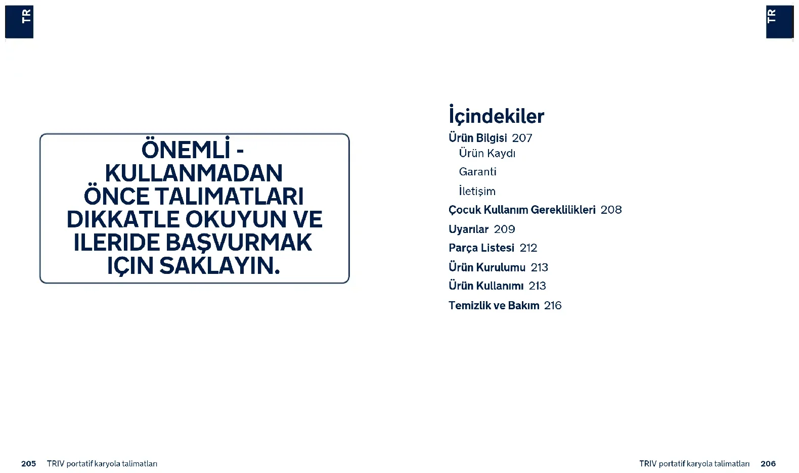 İçindekiler Ürün Bilgisi 207 Ürün Kaydı Garanti İletişim Çocuk Kullanım Gereklilikleri 208 Uyarılar 209 Parça Listesi 212 Ürün Kurulumu 213 Ürün Kullanımı 213 Temizlik ve Bakım 216 ÖNEMLİ - KULLANMADAN ÖNCE TALIMATLARI