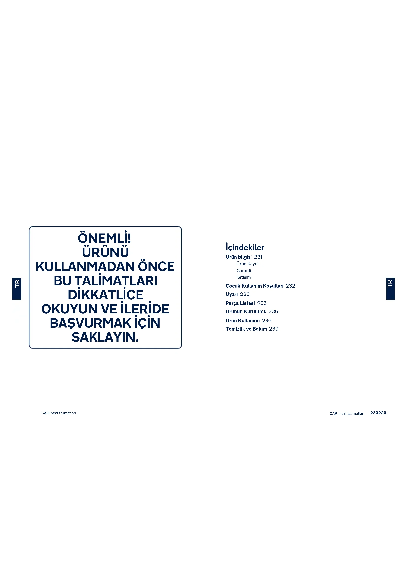 İçindekiler Ürün bilgisi 231 Ürün Kaydı Garanti İletişim Çocuk Kullanım Koşulları 232 Uyarı 233 Parça Listesi 235 Ürünün Kurulumu 236 Ürün Kullanımı 236 Temizlik ve Bakım 239 ÖNEMLİ﹗ ÜRÜNÜ KULLANMADAN ÖNCE