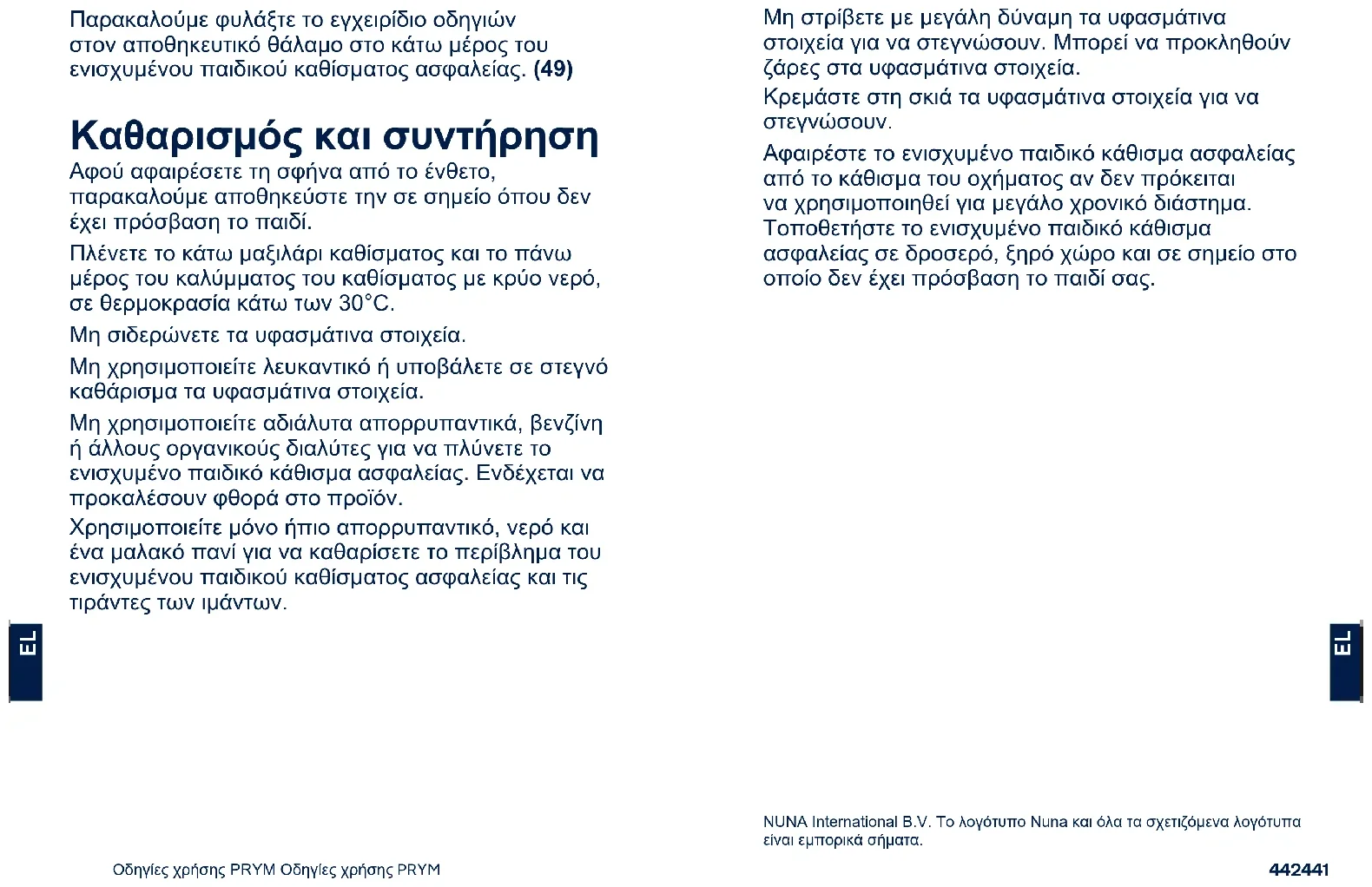4 Omuz kayışlarının arkasında bulunan ana koltuk pedindeki kopçaları açın. (44) 5 Omuz kayışlarını baş desteğinin altındaki kanadın arkasına geçirin. (45) 6 Kafa desteğinin üzerindeki elastik bantları açın ve kafa desteği tekstil malzemelerini çıkarın. (46)(47) 7 Ana koltuk minderindeki ve ayar kayışındaki kopçayı açın, (48)-1 ardından tekstil malzemelerini çıkarın. (48)-2 Tekstil malzemelerini monte etmek için yukarıdaki adımları ters yönde izleyin. Lütfen talimat kılavuzunu geliştirilmiş çocuk koltuğunun en altındaki saklama gözünde muhafaza edin. (49) Temizlik ve Bakım Takozu eklentiden çıkardıktan sonra lütfen çocuğun erişemeyeceği bir yerde saklayın. Alt koltuk minderini ve üst koltuk kaplamasını 30°C'nin altındaki soğuk suyla yıkayın. Yumuşak eşyaları ütülemeyin. Tekstil malzemelerinde ağartıcı kullanmayın veya kuru temizlemeye vermeyin. Geliştirilmiş çocuk koltuğunu yıkamak için, seyreltilmemiş deterjan, gaz ya da başka bir organik çözelti kullanmayın. Ürüne zarar verebilir. Sadece hafif deterjan, su ile birlikte yumuşak bir bez kullanarak geliştirilmiş çocuk koltuğunun kabuğunu ve kayışları temizleyin. Fazla kuvvet uygulayarak kurutmak için tekstil malzemelerini bükmeyin. Tekstil malzemelerinde kırışıklık bırakabilir. Lütfen tekstil malzemelerini gölgede asılı olarak kurutun. Uzun süre kullanılmayacaksa, lütfen geliştirilmiş çocuk koltuğunu araç koltuğundan çıkarın. Geliştirilmiş çocuk koltuğunu çocuğunuzun erişemeyeceği serin ve kuru bir yere koyun. NUNA International B.V. Nuna ve ilgili tüm logolar ticari markalardır.466465