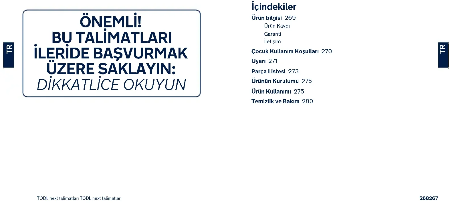 İçindekiler Ürün bilgisi 269 Ürün Kaydı Garanti İletişim Çocuk Kullanım Koşulları 270 Uyarı 271 Parça Listesi 273 Ürünün Kurulumu 275 Ürün Kullanımı 275 Temizlik ve Bakım 280 ÖNEMLİ!