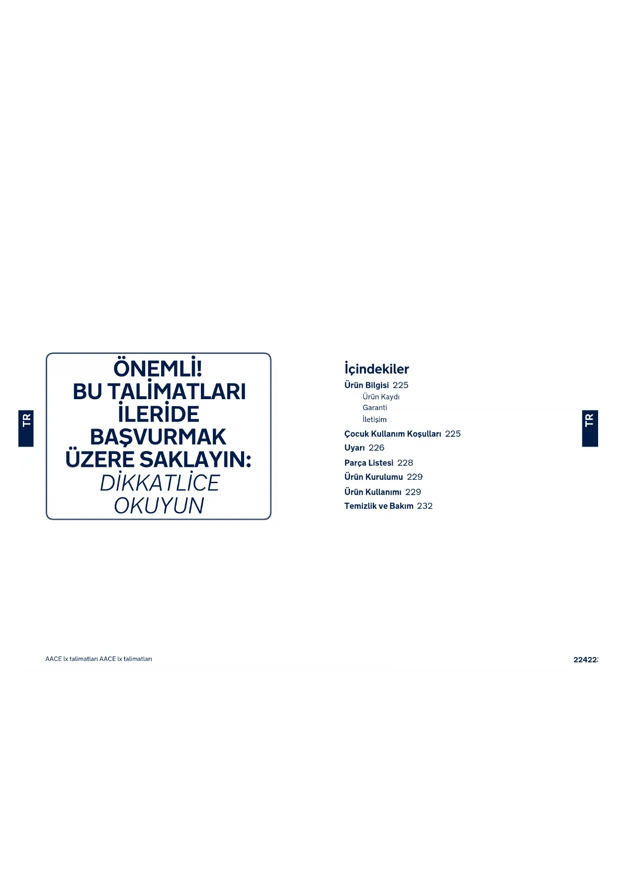 Οδηγίες χρήσης AACE lx Οδηγίες χρήσης AACE lxİçindekiler Ürün Bilgisi 225 Ürün Kaydı Garanti İletişim Çocuk Kullanım Koşulları 225 Uyarı 226 Parça Listesi 228 Ürün Kurulumu 229 Ürün Kullanımı 229 Temizlik ve Bakım 232 ÖNEMLİ!