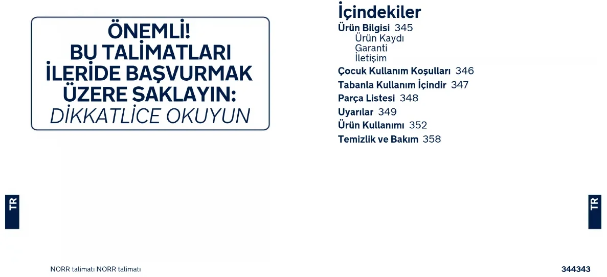 Οδηγίες χρήσης NORR Οδηγίες χρήσης NORRİçindekiler Ürün Bilgisi 345 Ürün Kaydı Garanti İletişim Çocuk Kullanım Koşulları 346 Tabanla Kullanım İçindir 347 Parça Listesi 348 Uyarılar 349 Ürün Kullanımı 352 Temizlik ve Bakım 358 ÖNEMLİ!