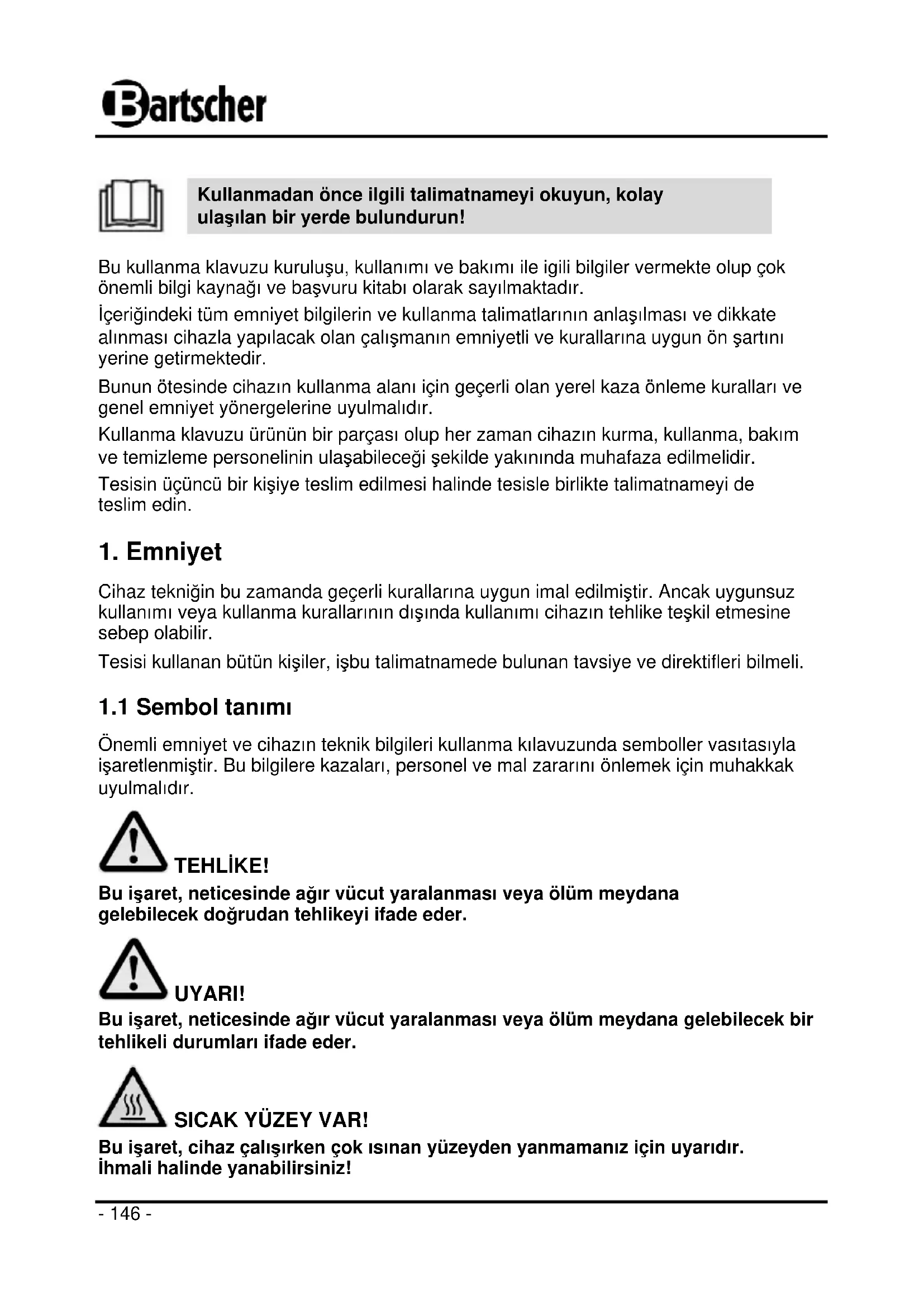Kullanmadan önce ilgili talimatnameyi okuyun, kolay ulaşılan bir yerde bulundurun! Bu kullanma klavuzu kuruluşu, kullanımı ve bakımı ile igili bilgiler vermekte olup çok önemli bilgi kaynağı ve başvuru kitabı olarak sayılmaktadır. İçeriğindeki tüm emniyet bilgilerin ve kullanma talimatlarının anlaşılması ve dikkate alınması cihazla yapılacak olan çalışmanın emniyetli ve kurallarına uygun ön şartını yerine getirmektedir. Bunun ötesinde cihazın kullanma alanı için geçerli olan yerel kaza önleme kuralları ve genel emniyet yönergelerine uyulmalıdır. Kullanma klavuzu ürünün bir parçası olup her zaman cihazın kurma, kullanma, bakım ve temizleme personelinin ulaşabileceği şekilde yakınında muhafaza edilmelidir. Tesisin üçüncü bir kişiye teslim edilmesi halinde tesisle birlikte talimatnameyi de teslim edin.