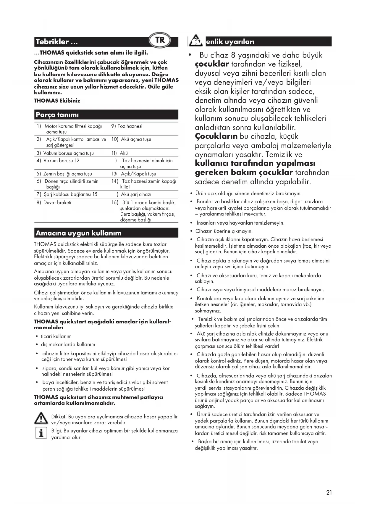 3‘ü 1 arada kombi başlık, şunlardan oluşmaktadır: Derz başlığı, vakum fırçası, döşeme başlığı Amacına uygun kullanım THOMAS quickstick elektrikli süpürge ile sadece kuru tozlar süpürülmelidir. Sadece evlerde kullanmak için öngörülmüştür. Elektrikli süpürgeyi sadece bu kullanım kılavuzunda belirtilen amaçlar için kullanabilirsiniz. Amacına uygun olmayan kullanım veya yanlış kullanım sonucu oluşabilecek zararlardan üretici sorumlu değildir. Bu nedenle aşağıdaki uyarılara mutlaka uyunuz. Cihazı çalıştırmadan önce kullanım kılavuzunun tamamı okunmuş ve anlaşılmış olmalıdır. Kullanım kılavuzunu iyi saklayın ve gerektiğinde cihazla birlikte cihazın yeni sahibine verin. THOMAS quickstart aşağıdaki amaçlar için kullanıl- mamalıdır: