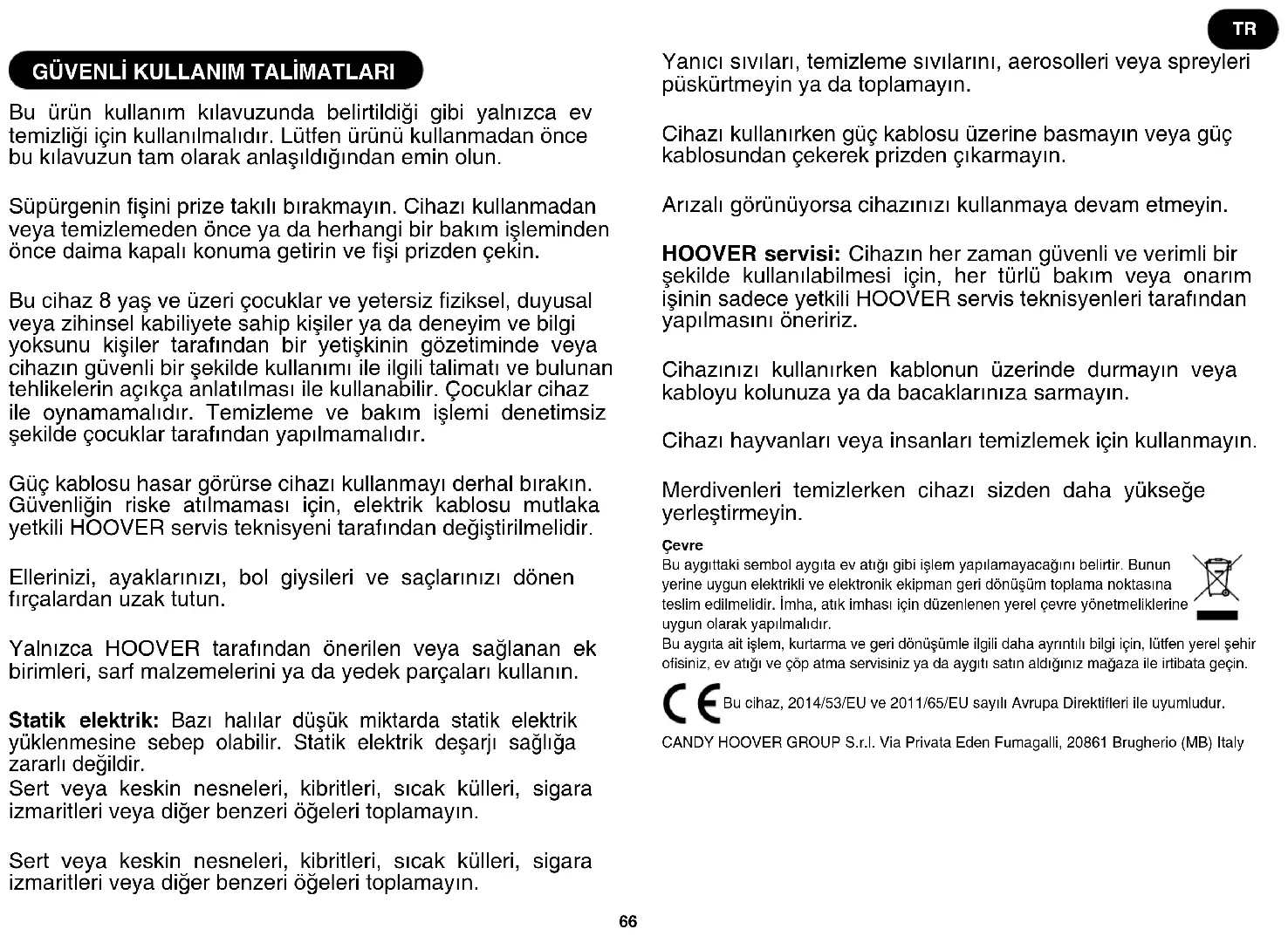 Bu ürün kullanım kılavuzunda belirtildiği gibi yalnızca ev temizliği için kullanılmalıdır. Lütfen ürünü kullanmadan önce bu kılavuzun tam olarak anlaşıldığından emin olun. Süpürgenin şini prize takılı bırakmayın. Cihazı kullanmadan veya temizlemeden önce ya da herhangi bir bakım işleminden önce daima kapalı konuma getirin ve şi prizden çekin. Bu cihaz 8 yaş ve üzeri çocuklar ve yetersiz ziksel, duyusal veya zihinsel kabiliyete sahip kişiler ya da deneyim ve bilgi yoksunu kişiler tarafından bir yetişkinin gözetiminde veya cihazın güvenli bir şekilde kullanımı ile ilgili talimatı ve bulunan tehlikelerin açıkça anlatılması ile kullanabilir. Çocuklar cihaz ile oynamamalıdır. Temizleme ve bakım işlemi denetimsiz şekilde çocuklar tarafından yapılmamalıdır. Güç kablosu hasar görürse cihazı kullanmayı derhal bırakın. Güvenliğin riske atılmaması için, elektrik kablosu mutlaka yetkili HOOVER servis teknisyeni tarafından değiştirilmelidir. Ellerinizi, ayaklarınızı, bol giysileri ve saçlarınızı dönen fırçalardan uzak tutun. Yalnızca HOOVER tarafından önerilen veya sağlanan ek birimleri, sarf malzemelerini ya da yedek parçaları kullanın. Statik elektrik: Bazı halılar düşük miktarda statik elektrik yüklenmesine sebep olabilir. Statik elektrik deşarjı sağlığa zararlı değildir. Sert veya keskin nesneleri, kibritleri, sıcak külleri, sigara izmaritleri veya diğer benzeri öğeleri toplamayın. Sert veya keskin nesneleri, kibritleri, sıcak külleri, sigara izmaritleri veya diğer benzeri öğeleri toplamayın. Yanıcı sıvıları, temizleme sıvılarını, aerosolleri veya spreyleri püskürtmeyin ya da toplamayın. Cihazı kullanırken güç kablosu üzerine basmayın veya güç kablosundan çekerek prizden çıkarmayın. Arızalı görünüyorsa cihazınızı kullanmaya devam etmeyin. HOOVER servisi: Cihazın her zaman güvenli ve verimli bir şekilde kullanılabilmesi için, her türlü bakım veya onarım işinin sadece yetkili HOOVER servis teknisyenleri tarafından yapılmasını öneririz. Cihazınızı kullanırken kablonun üzerinde durmayın veya kabloyu kolunuza ya da bacaklarınıza sarmayın. Cihazı hayvanları veya insanları temizlemek için kullanmayın. Merdivenleri temizlerken cihazı sizden daha yükseğe yerleştirmeyin. Çevre Bu aygıttaki sembol aygıta ev atığı gibi işlem yapılamayacağını belirtir. Bunun yerine uygun elektrikli ve elektronik ekipman geri dönüşüm toplama noktasına teslim edilmelidir. İmha, atık imhası için düzenlenen yerel çevre yönetmeliklerine uygun olarak yapılmalıdır. Bu aygıta ait işlem, kurtarma ve geri dönüşümle ilgili daha ayrıntılı bilgi için, lütfen yerel şehir osiniz, ev atığı ve çöp atma servisiniz ya da aygıtı satın aldığınız mağaza ile irtibata geçin. Bu cihaz, 2014/53/EU ve 2011/65/EU sayılı Avrupa Direktieri ile uyumludur. CANDY HOOVER GROUP S.r.l. Via Privata Eden Fumagalli, 20861 Brugherio (MB) Italy TR67