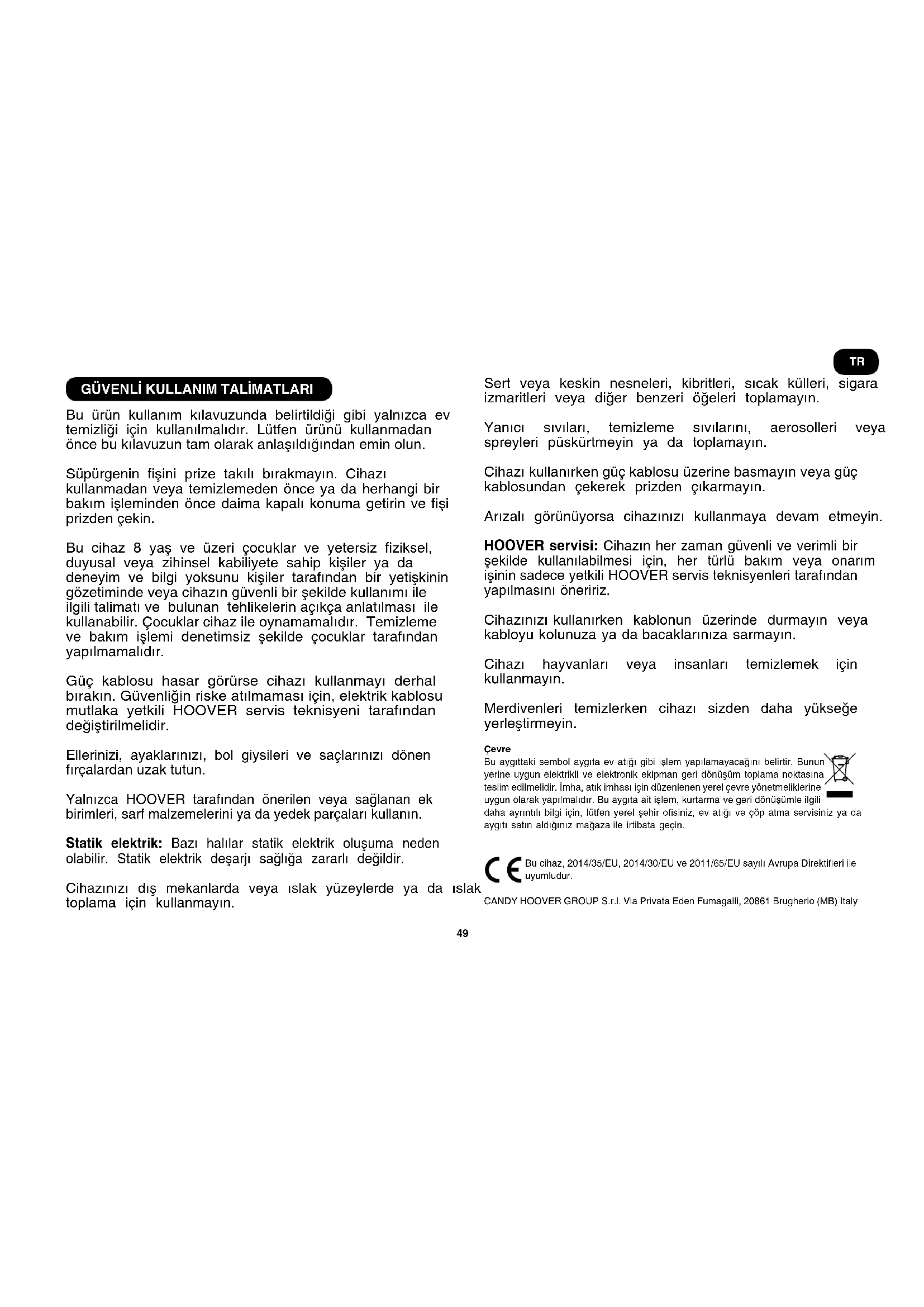 Bu ürün kullanım kılavuzunda belirtildiği gibi yalnızca ev temizliği için kullanılmalıdır. Lütfen ürünü kullanmadan önce bu kılavuzun tam olarak anlaşıldığından emin olun. Süpürgenin şini prize takılı bırakmayın. Cihazı kullanmadan veya temizlemeden önce ya da herhangi bir bakım işleminden önce daima kapalı konuma getirin ve şi prizden çekin. Bu cihaz 8 yaş ve üzeri çocuklar ve yetersiz ziksel, duyusal veya zihinsel kabiliyete sahip kişiler ya da deneyim ve bilgi yoksunu kişiler tarafından bir yetişkinin gözetiminde veya cihazın güvenli bir şekilde kullanımı ile ilgili talimatı ve bulunan tehlikelerin açıkça anlatılması ile kullanabilir. Çocuklar cihaz ile oynamamalıdır. Temizleme ve bakım işlemi denetimsiz şekilde çocuklar tarafından yapılmamalıdır. Güç kablosu hasar görürse cihazı kullanmayı derhal bırakın. Güvenliğin riske atılmaması için, elektrik kablosu mutlaka yetkili HOOVER servis teknisyeni tarafından değiştirilmelidir. Ellerinizi, ayaklarınızı, bol giysileri ve saçlarınızı dönen fırçalardan uzak tutun. Yalnızca HOOVER tarafından önerilen veya sağlanan ek birimleri, sarf malzemelerini ya da yedek parçaları kullanın. Statik elektrik: Bazı halılar statik elektrik oluşuma neden olabilir. Statik elektrik deşarjı sağlığa zararlı değildir. Cihazınızı dış mekanlarda veya ıslak yüzeylerde ya da ıslak toplama için kullanmayın. Sert veya keskin nesneleri, kibritleri, sıcak külleri, sigara izmaritleri veya diğer benzeri öğeleri toplamayın. Yanıcı sıvıları, temizleme sıvılarını, aerosolleri veya spreyleri püskürtmeyin ya da toplamayın. Cihazı kullanırken güç kablosu üzerine basmayın veya güç kablosundan çekerek prizden çıkarmayın. Arızalı görünüyorsa cihazınızı kullanmaya devam etmeyin. HOOVER servisi: Cihazın her zaman güvenli ve verimli bir şekilde kullanılabilmesi için, her türlü bakım veya onarım işinin sadece yetkili HOOVER servis teknisyenleri tarafından yapılmasını öneririz. Cihazınızı kullanırken kablonun üzerinde durmayın veya kabloyu kolunuza ya da bacaklarınıza sarmayın. Cihazı hayvanları veya insanları temizlemek için kullanmayın. Merdivenleri temizlerken cihazı sizden daha yükseğe yerleştirmeyin. Çevre Bu aygıttaki sembol aygıta ev atığı gibi işlem yapılamayacağını belirtir. Bunun yerine uygun elektrikli ve elektronik ekipman geri dönüşüm toplama noktasına teslim edilmelidir. İmha, atık imhası için düzenlenen yerel çevre yönetmeliklerine uygun olarak yapılmalıdır. Bu aygıta ait işlem, kurtarma ve geri dönüşümle ilgili daha ayrıntılı bilgi için, lütfen yerel şehir osiniz, ev atığı ve çöp atma servisiniz ya da aygıtı satın aldığınız mağaza ile irtibata geçin. Bu cihaz, 2014/35/EU, 2014/30/EU ve 2011/65/EU sayılı Avrupa Direktieri ile uyumludur. CANDY HOOVER GROUP s.r.l. Via Privata Eden Fumagalli, 20861 Brugherio (MB) Italy TR50 SÜPÜRGENİZİN PARÇALARI A. Hortum B. Torba Kapağı C. Çıkış Filtresi Kapağı D. Ana Gövde E. Taşıma Kolu F. Torba Kapağı Açma Mandalı G. Mekanik Torba Kontrol Göstergesi H. Açma/Kapama Pedalı