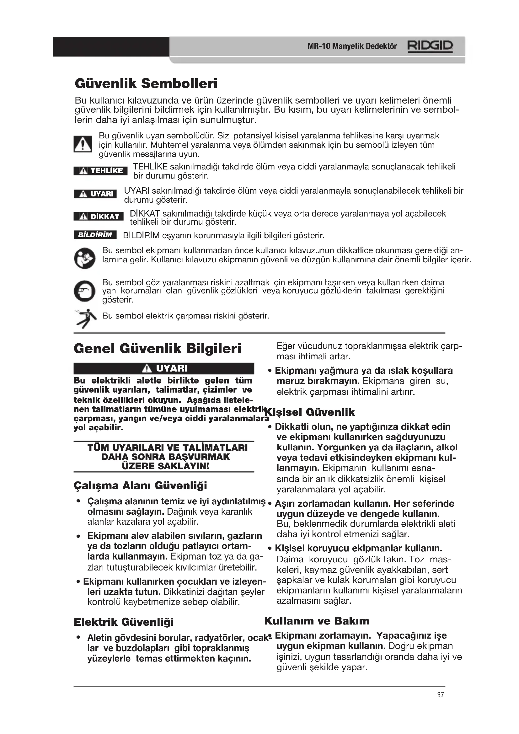 - Ekipmanınızın onarımını yetkili uzman kişilere sadece orijinal yedek parçaları kullanarak yaptırın. Bu, aletin güvenliğinin devamlılığını sağlayacaktır. Özel Güvenlik Bilgileri UYARI Bu bölüm, konum belirleme aletine özelönemli güvenlik bilgisi içerir.Elektrik çarpması veya diğer ciddiyaralanma riskini azaltmak için RIDGID MR-10 Manyetik Dedektörü kullanmadanönce bu uyarıları dikkatli bir şekilde okuyun. BU TALİMATLARI SAKLAYIN! Operatörün kullanması için bu kılavuzu aletin yanında bulundurun. MR-10 Manyetik Dedektör Güvenlik