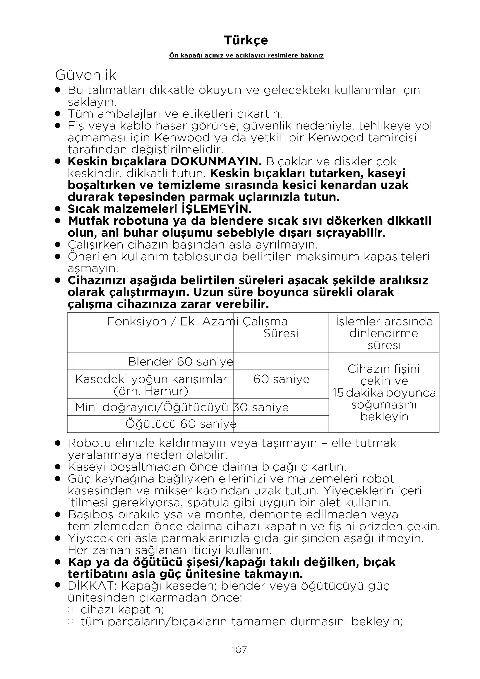 Cihazınızın çalışması ile ilgili herhangi bir sorun yaşarsanız, yardım istemeden önce bu kılavuzdaki ‘Sorun Giderme Kılavuzu’ bölümüne bakın veya www.kenwoodworld.com adresini ziyaret edin. Lütfen unutmayın, ürün ürünün satıldığı ülkedeki mevcut tüm garanti ve tüketici hakları ile ilgili yasal mevzuata uygun bir garanti kapsamındadır. Kenwood ürününüz arızalanırsa veya herhangi bir kusur bulursanız yetkili KENWOOD Servis Merkezine gönderin veya götürün. Size en yakın yetkili KENWOOD Servis Merkezinin güncel bilgilerine ulaşmak için www.kenwoodworld.com adresini veya ülkenize özel web sitesini ziyaret edin. Kenwood tarafından İngiltere’de dizayn edilmiş ve geliştirilmiştir. Çin’de üretilmiştir.113 ÜRÜNÜN ATIK ELEKTRİKLİ VE ELEKTRONİK EKİPMANIN BERTARAF EDİLMESİNE İLİŞKİN AVRUPA DİREKTİFİNE UYGUN ŞEKİLDE BERTARAF EDİLMESİ HAKKINDA ÖNEMLİ BİLGİ (WEEE) Kullanım ömrünün sonunda ürün evsel atıklarla birlikte atılmamalıdır. Ürün yerel yetkililerce belirlenmiş atık toplama merkezine veya bu hizmeti sağlayan bir satıcıya götürülmelidir. Tavsiye Edilen Kullanım Tablosu Cihazınızı, dinlendirmeden aşağıda belirtilen sürelerden daha uzun süre çalıştırmayın. Aşağıdaki tabloda belirtilen maksimum kapasiteleri aşmayın. Cihazınızı uzun süreli sürekli çalıştırmak ona zarar verebilir. Verilen işleme bilgileri sadece bilgi amaçlıdır ve işlenmekte olan tam tarife ve malzemelere bağlı olar- ak farklılık gösterebilir. Sıcak malzemeleri işlemeyin Araç/Aparat Şlevi (Saniye) Hepsi bir arada kek karışımları 2 10 1,2 kg toplam ağırlık Pastacılık – una yağ eklemek Hamur malzemelerini birleştirmek için su ekleme