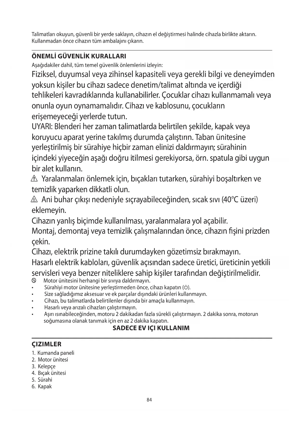 Aşağıdakiler dahil, tüm temel güvenlik önlemlerini izleyin: Fiziksel, duyumsal veya zihinsel kapasiteli veya gerekli bilgi ve deneyimden yoksun kişiler bu cihazı sadece denetim/talimat altında ve içerdiği tehlikeleri kavradıklarında kullanabilirler. Çocuklar cihazı kullanmamalı veya onunla oyun oynamamalıdır. Cihazı ve kablosunu, çocukların erişemeyeceği yerlerde tutun. UYARI: Blenderi her zaman talimatlarda belirtilen şekilde, kapak veya koruyucu aparat yerine takılmış durumda çalıştırın. Taban ünitesine yerleştirilmiş bir sürahiye hiçbir zaman elinizi daldırmayın; sürahinin içindeki yiyeceğin aşağı doğru itilmesi gerekiyorsa, örn. spatula gibi uygun bir alet kullanın. c Yaralanmaları önlemek için, bıçakları tutarken, sürahiyi boşaltırken ve temizlik yaparken dikkatli olun. h Ani buhar çıkışı nedeniyle sıçrayabileceğinden, sıcak sıvı (40°C üzeri) eklemeyin. Cihazın yanlış biçimde kullanılması, yaralanmalara yol açabilir. Montaj, demontaj veya temizlik çalışmalarından önce, cihazın şini prizden çekin. Cihazı, elektrik prizine takılı durumdayken gözetimsiz bırakmayın. Hasarlı elektrik kabloları, güvenlik açısından sadece üretici, üreticinin yetkili servisleri veya benzer niteliklere sahip kişiler tarafından değiştirilmelidir. l Motor ünitesini herhangi bir sıvıya daldırmayın.