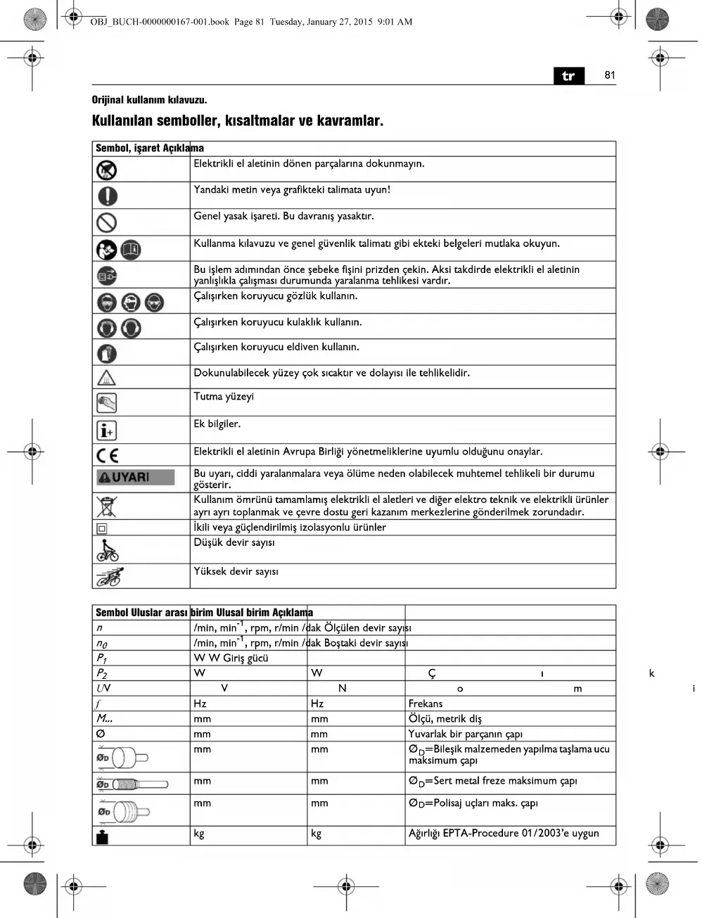 Temel ve türetilen değerler uluslar arası birimler sistemi SI’den alınmıştır. Sembol Uluslar arası birim Ulusal birim Açıklama OBJ_BUCH-0000000167-001.book Page 82 Tuesday, January 27, 2015 9:01 AM83