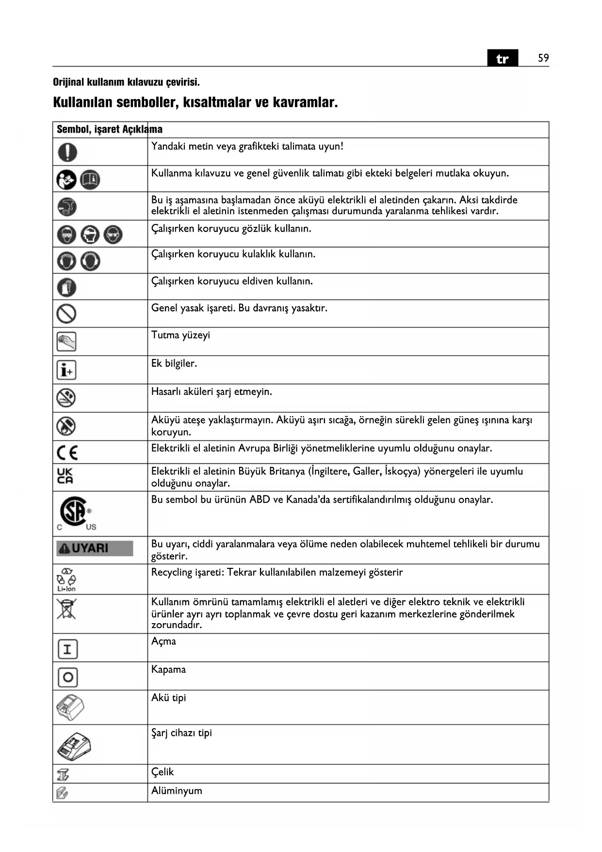 Orijinal kullanım kılavuzu çevirisi. Kullanılan semboller, kısaltmalar ve kavramlar. Sembol, işaret Açıklama Yandaki metin veya grafikteki talimata uyun! Kullanma kılavuzu ve genel güvenlik talimatı gibi ekteki belgeleri mutlaka okuyun. Bu iş aşamasına başlamadan önce aküyü elektrikli el aletinden çakarın. Aksi takdirde elektrikli el aletinin istenmeden çalışması durumunda yaralanma tehlikesi vardır. Çalışırken koruyucu gözlük kullanın. Çalışırken koruyucu kulaklık kullanın. Çalışırken koruyucu eldiven kullanın. Genel yasak işareti. Bu davranış yasaktır. Tutma yüzeyi Ek bilgiler. Hasarlı aküleri şarj etmeyin. Aküyü ateşe yaklaştırmayın. Aküyü aşırı sıcağa, örneğin sürekli gelen güneş ışınına karşı koruyun. Elektrikli el aletinin Avrupa Birliği yönetmeliklerine uyumlu olduğunu onaylar. Elektrikli el aletinin Büyük Britanya (İngiltere, Galler, İskoçya) yönergeleri ile uyumlu olduğunu onaylar. Bu sembol bu ürünün ABD ve Kanada’da sertifikalandırılmış olduğunu onaylar. Bu uyarı, ciddi yaralanmalara veya ölüme neden olabilecek muhtemel tehlikeli bir durumu gösterir. Recycling işareti: Tekrar kullanılabilen malzemeyi gösterir Kullanım ömrünü tamamlamış elektrikli el aletleri ve diğer elektro teknik ve elektrikli ürünler ayrı ayrı toplanmak ve çevre dostu geri kazanım merkezlerine gönderilmek zorundadır. Açma Kapama Akü tipi Şarj cihazı tipi Çelik Alüminyum60