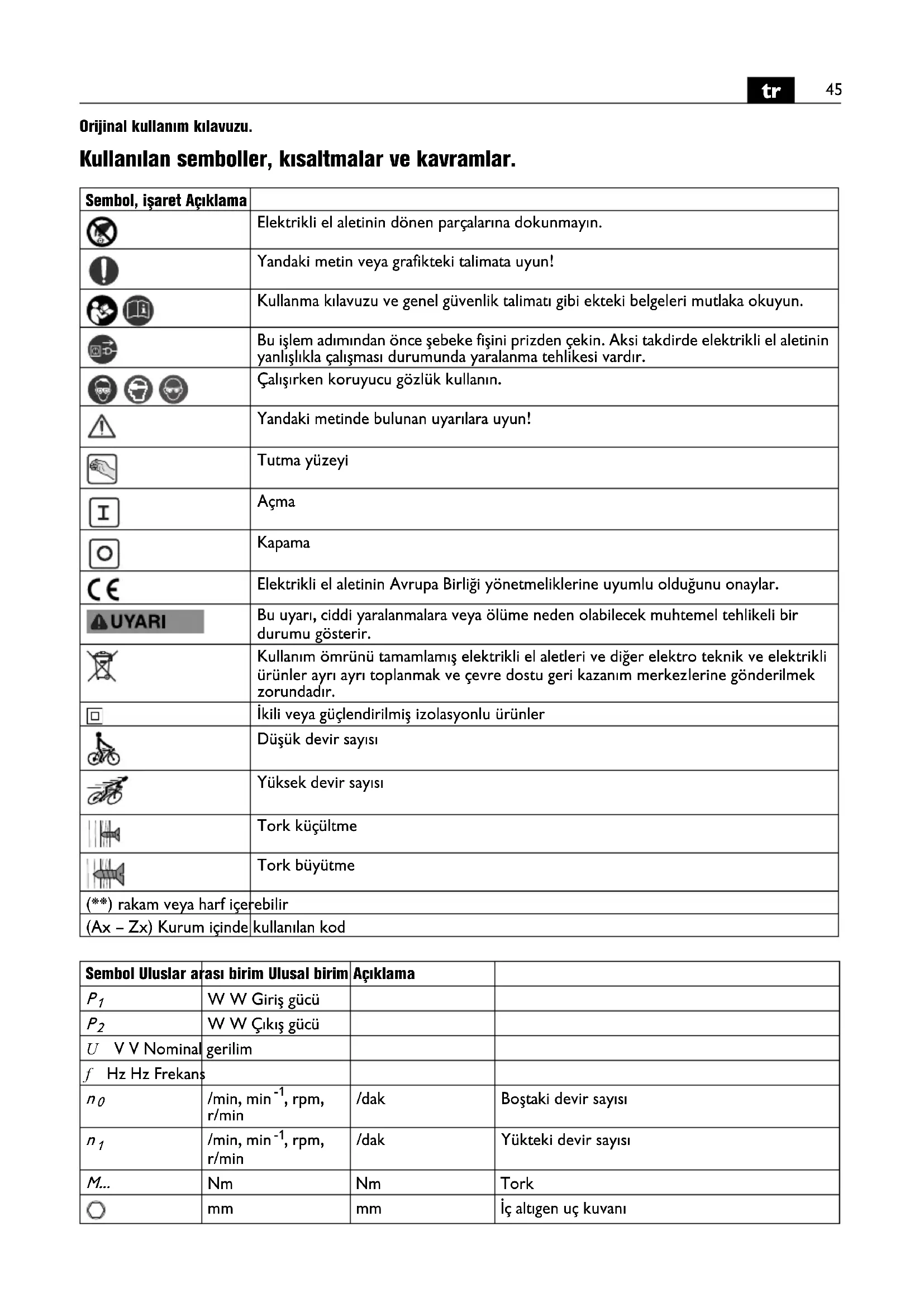 Orijinal kullanım kılavuzu. Kullanılan semboller, kısaltmalar ve kavramlar. Sembol, işaret Açıklama Elektrikli el aletinin dönen parçalarına dokunmayın. Yandaki metin veya grafikteki talimata uyun! Kullanma kılavuzu ve genel güvenlik talimatı gibi ekteki belgeleri mutlaka okuyun. Bu işlem adımından önce şebeke fişini prizden çekin. Aksi takdirde elektrikli el aletinin yanlışlıkla çalışması durumunda yaralanma tehlikesi vardır. Çalışırken koruyucu gözlük kullanın. Yandaki metinde bulunan uyarılara uyun! Tutma yüzeyi Açma Kapama Elektrikli el aletinin Avrupa Birliği yönetmeliklerine uyumlu olduğunu onaylar. Bu uyarı, ciddi yaralanmalara veya ölüme neden olabilecek muhtemel tehlikeli bir durumu gösterir. Kullanım ömrünü tamamlamış elektrikli el aletleri ve diğer elektro teknik ve elektrikli ürünler ayrı ayrı toplanmak ve çevre dostu geri kazanım merkezlerine gönderilmek zorundadır. İkili veya güçlendirilmiş izolasyonlu ürünler Düşük devir sayısı Yüksek devir sayısı Tork küçültme Tork büyütme (**) rakam veya harf içerebilir (Ax – Zx) Kurum içinde kullanılan kod Sembol Uluslar arası birim Ulusal birim Açıklama