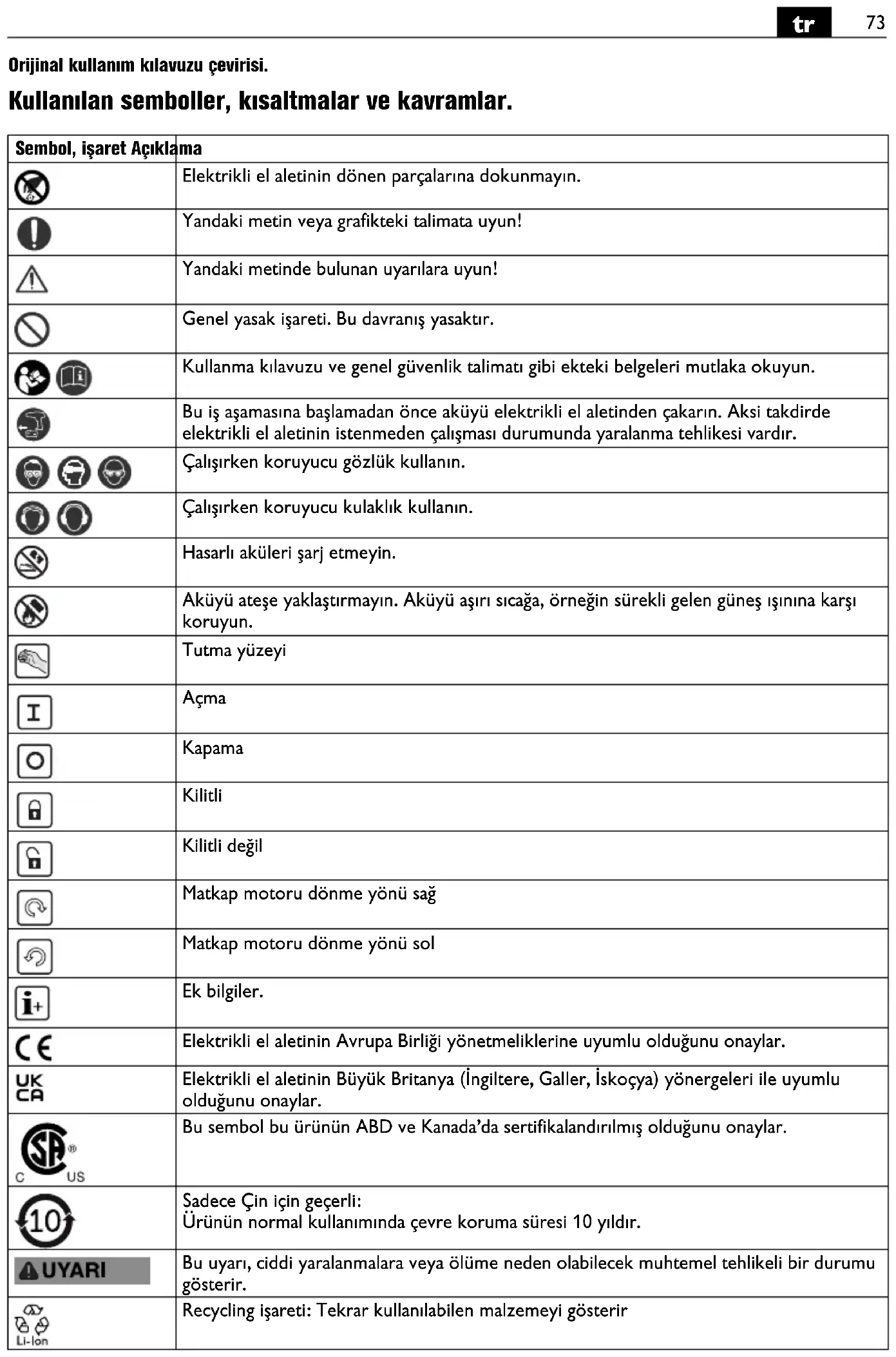 Orijinal kullanım kılavuzu çevirisi. Kullanılan semboller, kısaltmalar ve kavramlar. Sembol, işaret Açıklama Elektrikli el aletinin dönen parçalarına dokunmayın. Yandaki metin veya grafikteki talimata uyun! Yandaki metinde bulunan uyarılara uyun! Genel yasak işareti. Bu davranış yasaktır. Kullanma kılavuzu ve genel güvenlik talimatı gibi ekteki belgeleri mutlaka okuyun. Bu iş aşamasına başlamadan önce aküyü elektrikli el aletinden çakarın. Aksi takdirde elektrikli el aletinin istenmeden çalışması durumunda yaralanma tehlikesi vardır. Çalışırken koruyucu gözlük kullanın. Çalışırken koruyucu kulaklık kullanın. Hasarlı aküleri şarj etmeyin. Aküyü ateşe yaklaştırmayın. Aküyü aşırı sıcağa, örneğin sürekli gelen güneş ışınına karşı koruyun. Tutma yüzeyi Açma Kapama Kilitli Kilitli değil Matkap motoru dönme yönü sağ Matkap motoru dönme yönü sol Ek bilgiler. Elektrikli el aletinin Avrupa Birliği yönetmeliklerine uyumlu olduğunu onaylar. Elektrikli el aletinin Büyük Britanya (İngiltere, Galler, İskoçya) yönergeleri ile uyumlu olduğunu onaylar. Bu sembol bu ürünün ABD ve Kanada’da sertifikalandırılmış olduğunu onaylar. Sadece Çin için geçerli: Ürünün normal kullanımında çevre koruma süresi 10 yıldır. Bu uyarı, ciddi yaralanmalara veya ölüme neden olabilecek muhtemel tehlikeli bir durumu gösterir. Recycling işareti: Tekrar kullanılabilen malzemeyi gösterir74