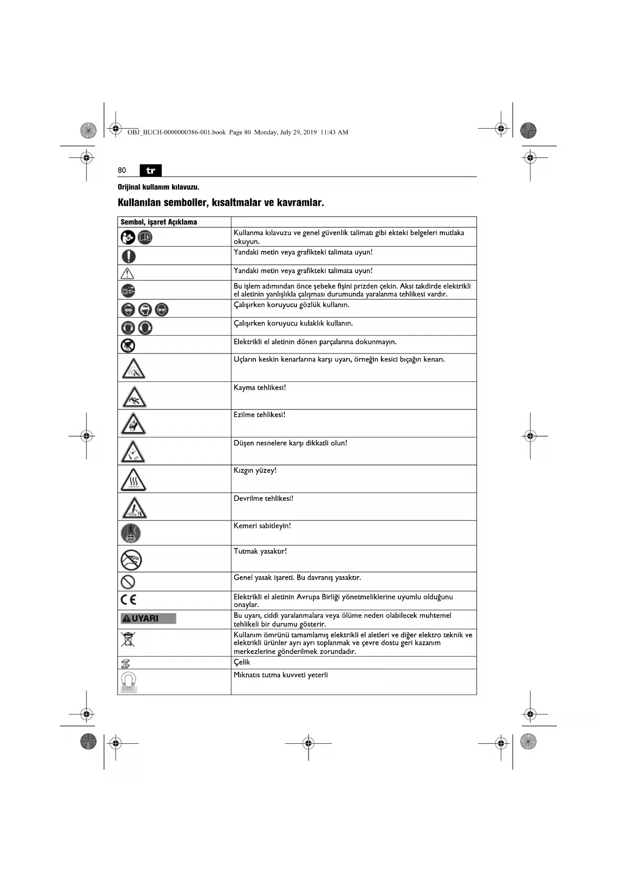 Orijinal kullanım kılavuzu. Kullanılan semboller, kısaltmalar ve kavramlar. Sembol, işaret Açıklama Kullanma kılavuzu ve genel güvenlik talimatı gibi ekteki belgeleri mutlaka okuyun. Yandaki metin veya grafikteki talimata uyun! Yandaki metin veya grafikteki talimata uyun! Bu işlem adımından önce şebeke fişini prizden çekin. Aksi takdirde elektrikli el aletinin yanlışlıkla çalışması durumunda yaralanma tehlikesi vardır. Çalışırken koruyucu gözlük kullanın. Çalışırken koruyucu kulaklık kullanın. Elektrikli el aletinin dönen parçalarına dokunmayın. Uçların keskin kenarlarına karşı uyarı, örneğin kesici bıçağın kenarı. Kayma tehlikesi! Ezilme tehlikesi! Düşen nesnelere karşı dikkatli olun! Kızgın yüzey! Devrilme tehlikesi! Kemeri sabitleyin! Tutmak yasaktır! Genel yasak işareti. Bu davranış yasaktır. Elektrikli el aletinin Avrupa Birliği yönetmeliklerine uyumlu olduğunu onaylar. Bu uyarı, ciddi yaralanmalara veya ölüme neden olabilecek muhtemel tehlikeli bir durumu gösterir. Kullanım ömrünü tamamlamış elektrikli el aletleri ve diğer elektro teknik ve elektrikli ürünler ayrı ayrı toplanmak ve çevre dostu geri kazanım merkezlerine gönderilmek zorundadır. Çelik Mıknatıs tutma kuvveti yeterli OBJ_BUCH-0000000386-001.book Page 80 Monday, July 29, 2019 11:43 AM81